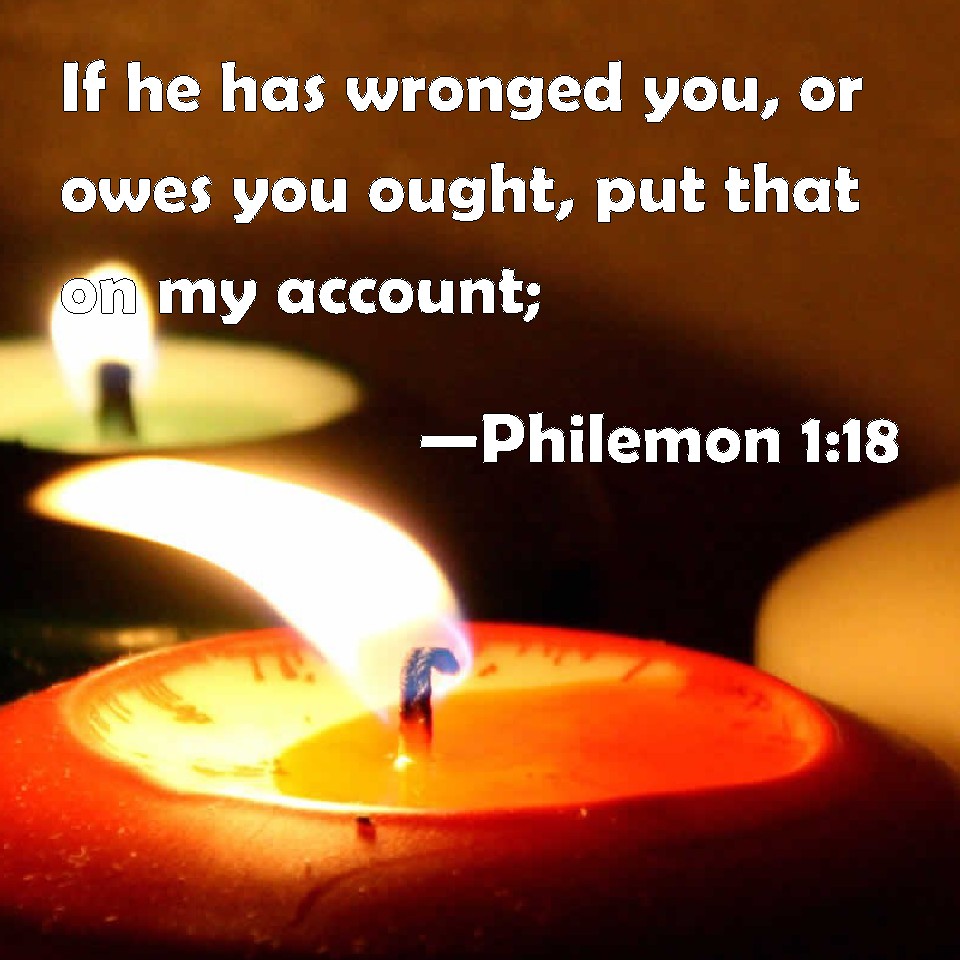Choose a Background Philemon 1:18 If he has wronged you, or owes you ought, put that on my account; KJV: If he hath wronged thee, or oweth thee ought, put that on mine account; DRB: And if he hath wronged thee in any thing, or is in thy debt, put that to my account. DBT: but if he have wronged thee anything or owe anything to thee, put this to my account. ERV: But if he hath wronged thee at all, or oweth thee aught, put that to mine account; WBT: If he hath wronged thee, or oweth thee aught, put that on my account; WEB: But if he has wronged you at all, or owes you anything, put that to my account. YLT: and if he did hurt to thee, or doth owe anything, this to me be reckoning;Links Philemon 1:18 NIV • Philemon 1:18 NLT • Philemon 1:18 ESV • Philemon 1:18 NASB • Philemon 1:18 KJV • Philemon 1:18 Interlinear • Philemon 1:18 Commentaries • Philemon 1:18 Parallel Texts • Philemon 1:18 Bible Apps • Philemon 1:18 Parallel • Bible Hub |