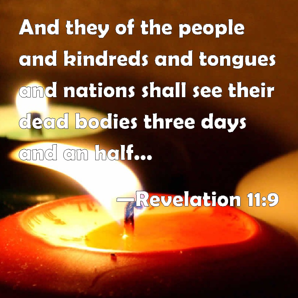 Choose a Background Revelation 11:9 And they of the people and kindreds and tongues and nations shall see their dead bodies three days and an half, and shall not suffer their dead bodies to be put in graves. KJV: And they of the people and kindreds and tongues and nations shall see their dead bodies three days and an half, and shall not suffer their dead bodies to be put in graves. DRB: And they of the tribes, and peoples, and tongues, and nations, shall see their bodies for three days and a half: and they shall not suffer their bodies to be laid in sepulchres. DBT: And men of the peoples and tribes and tongues and nations see their body three days and a half, and they do not suffer their bodies to be put into a sepulchre. ERV: And from among the peoples and tribes and tongues and nations do men look upon their dead bodies three days and a half, and suffer not their dead bodies to be laid in a tomb. WBT: And they of the people, and kindreds, and languages, and nations, shall see their dead bodies three days and a half, and shall not suffer their dead bodies to be put in graves. WEB: From among the peoples, tribes, languages, and nations people will look at their dead bodies for three and a half days, and will not allow their dead bodies to be laid in a tomb. YLT: and they shall behold — they of the peoples, and tribes, and tongues, and nations — their dead bodies three days and a half, and their dead bodies they shall not suffer to be put into tombs,Links Revelation 11:9 NIV • Revelation 11:9 NLT • Revelation 11:9 ESV • Revelation 11:9 NASB • Revelation 11:9 KJV • Revelation 11:9 Interlinear • Revelation 11:9 Commentaries • Revelation 11:9 Parallel Texts • Revelation 11:9 Bible Apps • Revelation 11:9 Parallel • Bible Hub |