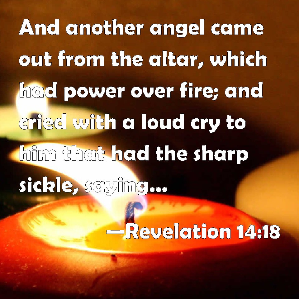 Choose a Background Revelation 14:18 And another angel came out from the altar, which had power over fire; and cried with a loud cry to him that had the sharp sickle, saying, Thrust in your sharp sickle, and gather the clusters of the vine of the earth; for her grapes are fully ripe. KJV: And another angel came out from the altar, which had power over fire; and cried with a loud cry to him that had the sharp sickle, saying, Thrust in thy sharp sickle, and gather the clusters of the vine of the earth; for her grapes are fully ripe. DRB: And another angel came out from the altar, who had power over fire; and he cried with a loud voice to him that had the sharp sickle, saying: Thrust in thy sharp sickle, and gather the clusters of the vineyard of the earth; because the grapes thereof are ripe. DBT: And another angel came out of the altar, having power over fire, and called with a loud cry to him that had the sharp sickle, saying, Send thy sharp sickle, and gather the bunches of the vine of the earth; for her grapes are fully ripened. ERV: And another angel came out from the altar, he that hath power over fire; and he called with a great voice to him that had the sharp sickle, saying, Send forth thy sharp sickle, and gather the clusters of the vine of the earth; for her grapes are fully ripe. WBT: And another angel came out from the altar, who had power over fire; and cried with a loud cry to him that had the sharp sickle, saying, Thrust in thy sharp sickle, and gather the clusters of the vine of the earth; for her grapes are fully ripe. WEB: Another angel came out from the altar, he who has power over fire, and he called with a great voice to him who had the sharp sickle, saying, "Send forth your sharp sickle, and gather the clusters of the vine of the earth, for the earth's grapes are fully ripe!" YLT: and another messenger did come forth out from the altar, having authority over the fire, and he called with a great cry to him having the sharp sickle, saying, 'Send forth thy sharp sickle, and gather the clusters of the vine of the earth, because come to perfection have her grapes;'Links Revelation 14:18 NIV • Revelation 14:18 NLT • Revelation 14:18 ESV • Revelation 14:18 NASB • Revelation 14:18 KJV • Revelation 14:18 Interlinear • Revelation 14:18 Commentaries • Revelation 14:18 Parallel Texts • Revelation 14:18 Bible Apps • Revelation 14:18 Parallel • Bible Hub |