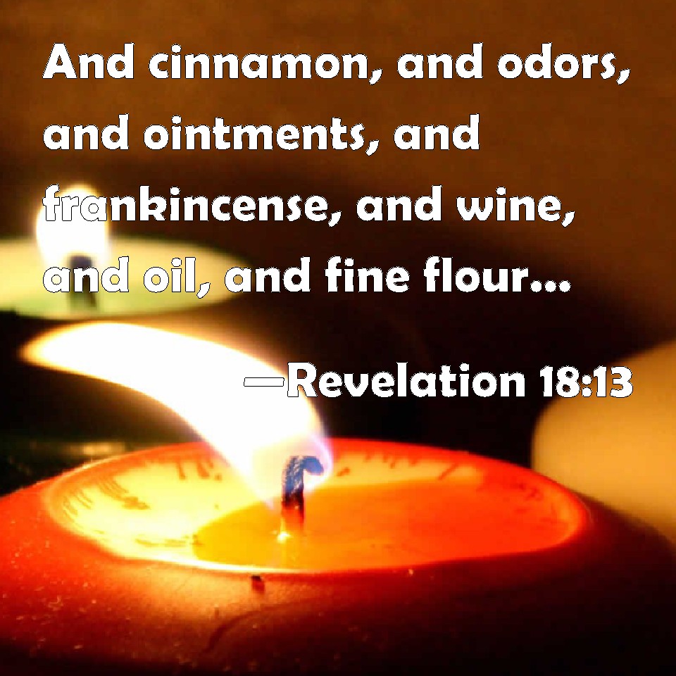 Choose a Background Revelation 18:13 And cinnamon, and odors, and ointments, and frankincense, and wine, and oil, and fine flour, and wheat, and beasts, and sheep, and horses, and chariots, and slaves, and souls of men. KJV: And cinnamon, and odours, and ointments, and frankincense, and wine, and oil, and fine flour, and wheat, and beasts, and sheep, and horses, and chariots, and slaves, and souls of men. DRB: And cinnamon, and odours, and ointment, and frankincense, and wine, and oil, and fine flour, and wheat, and beasts, and sheep, and horses, and chariots, and slaves, and souls of men. DBT: and cinnamon, and amomum, and incense, and unguent, and frankincense, and wine, and oil, and fine flour, and wheat, and cattle, and sheep, and of horses, and of chariots, and of bodies, and souls of men. ERV: and cinnamon, and spice, and incense, and ointment, and frankincense, and wine, and oil, and fine flour, and wheat, and cattle, and sheep; and merchandise of horses and chariots and slaves; and souls of men. WBT: And cinnamon, and odors, and ointments, and frankincense, and wine, and oil, and fine flour, and wheat, and beasts, and sheep, and horses, and chariots, and slaves, and souls of men. WEB: and cinnamon, incense, perfume, frankincense, wine, olive oil, fine flour, wheat, sheep, horses, chariots, and people's bodies and souls. YLT: and cinnamon, and odours, and ointment, and frankincense, and wine, and oil, and fine flour, and wheat, and cattle, and sheep, and of horses, and of chariots, and of bodies and souls of men.Links Revelation 18:13 NIV • Revelation 18:13 NLT • Revelation 18:13 ESV • Revelation 18:13 NASB • Revelation 18:13 KJV • Revelation 18:13 Interlinear • Revelation 18:13 Commentaries • Revelation 18:13 Parallel Texts • Revelation 18:13 Bible Apps • Revelation 18:13 Parallel • Bible Hub |