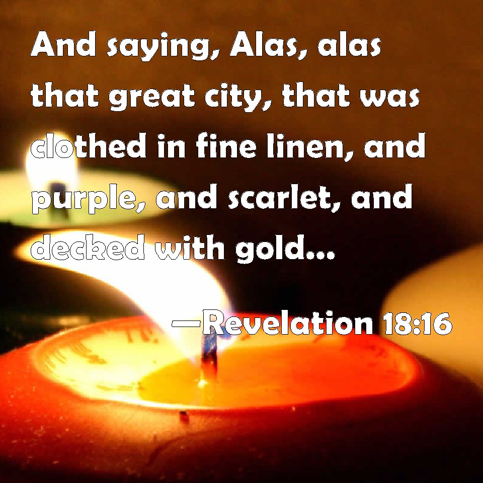 Choose a Background Revelation 18:16 And saying, Alas, alas that great city, that was clothed in fine linen, and purple, and scarlet, and decked with gold, and precious stones, and pearls! KJV: And saying, Alas, alas, that great city, that was clothed in fine linen, and purple, and scarlet, and decked with gold, and precious stones, and pearls! DRB: And saying: Alas! alas! that great city, which was clothed with fine linen, and purple, and scarlet, and was gilt with gold, and precious stones, and pearls. DBT: saying, Woe, woe, the great city, which was clothed with fine linen and purple and scarlet, and had ornaments of gold and precious stones and pearls! ERV: saying, Woe, woe, the great city, she that was arrayed in fine linen and purple and scarlet, and decked with gold and precious stone and pearl! WBT: And saying, Alas, alas, that great city, that was clothed in fine linen, and purple, and scarlet, and decked with gold, and precious stones, and pearls! WEB: saying, 'Woe, woe, the great city, she who was dressed in fine linen, purple, and scarlet, and decked with gold and precious stones and pearls! YLT: and saying, Woe, woe, the great city, that was arrayed with fine linen, and purple, and scarlet, and gilded in gold, and precious stone, and pearls — because in one hour so much riches were made waste!Links Revelation 18:16 NIV • Revelation 18:16 NLT • Revelation 18:16 ESV • Revelation 18:16 NASB • Revelation 18:16 KJV • Revelation 18:16 Interlinear • Revelation 18:16 Commentaries • Revelation 18:16 Parallel Texts • Revelation 18:16 Bible Apps • Revelation 18:16 Parallel • Bible Hub |