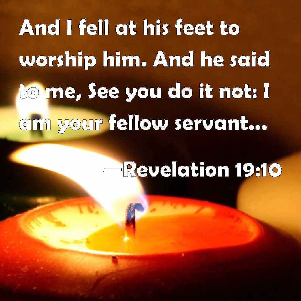 Choose a Background Revelation 19:10 And I fell at his feet to worship him. And he said to me, See you do it not: I am your fellow servant, and of your brothers that have the testimony of Jesus: worship God: for the testimony of Jesus is the spirit of prophecy. KJV: And I fell at his feet to worship him. And he said unto me, See thou do it not: I am thy fellowservant, and of thy brethren that have the testimony of Jesus: worship God: for the testimony of Jesus is the spirit of prophecy. DRB: And I fell down before his feet, to adore him. And he saith to me: See thou do it not: I am thy fellow servant, and of thy brethren, who have the testimony of Jesus. Adore God. For the testimony of Jesus is the spirit of prophecy. DBT: And I fell before his feet to do him homage. And he says to me, See thou do it not. I am thy fellow-bondman, and the fellow-bondman of thy brethren who have the testimony of Jesus. Do homage to God. For the spirit of prophecy is the testimony of Jesus. ERV: And I fell down before his feet to worship him. And he saith unto me, See thou do it not: I am a fellow-servant with thee and with thy brethren that hold the testimony of Jesus: worship God: for the testimony of Jesus is the spirit of prophecy. WBT: And I fell at his feet to worship him. And he said to me, See thou do it not: I am thy fellow-servant, and of thy brethren that have the testimony of Jesus: worship God: for the testimony of Jesus is the spirit of prophecy. WEB: I fell down before his feet to worship him. He said to me, "Look! Don't do it! I am a fellow bondservant with you and with your brothers who hold the testimony of Jesus. Worship God, for the testimony of Jesus is the Spirit of Prophecy." YLT: and I fell before his feet, to bow before him, and he saith to me, 'See — not! fellow servant of thee am I, and of thy brethren, those having the testimony of Jesus; bow before God, for the testimony of Jesus is the spirit of the prophecy.'Links Revelation 19:10 NIV • Revelation 19:10 NLT • Revelation 19:10 ESV • Revelation 19:10 NASB • Revelation 19:10 KJV • Revelation 19:10 Interlinear • Revelation 19:10 Commentaries • Revelation 19:10 Parallel Texts • Revelation 19:10 Bible Apps • Revelation 19:10 Parallel • Bible Hub |