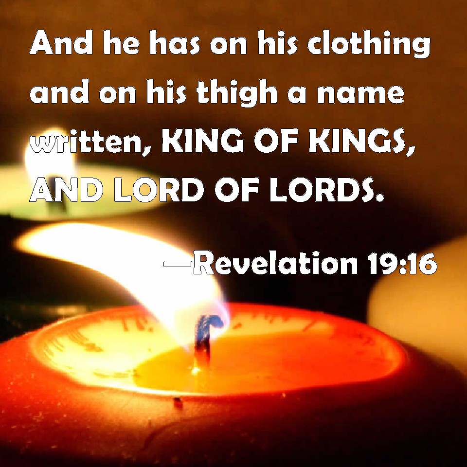Choose a Background Revelation 19:16 And he has on his clothing and on his thigh a name written, KING OF KINGS, AND LORD OF LORDS. KJV: And he hath on his vesture and on his thigh a name written, KING OF KINGS, AND LORD OF LORDS. DRB: And he hath on his garment, and on his thigh written: KING OF KINGS, AND LORD OF LORDS. DBT: And he has upon his garment, and upon his thigh, a name written, King of kings, and Lord of lords. ERV: And he hath on his garment and on his thigh a name written, KING OF KINGS, AND LORD OF LORDS. WBT: And he hath on his vesture and on his thigh a name written, KING OF KINGS AND LORD OF LORDS. WEB: He has on his garment and on his thigh a name written, "KING OF KINGS, AND LORD OF LORDS." YLT: and he hath upon the garment and upon his thigh the name written, 'King of kings, and Lord of lords.'Links Revelation 19:16 NIV • Revelation 19:16 NLT • Revelation 19:16 ESV • Revelation 19:16 NASB • Revelation 19:16 KJV • Revelation 19:16 Interlinear • Revelation 19:16 Commentaries • Revelation 19:16 Parallel Texts • Revelation 19:16 Bible Apps • Revelation 19:16 Parallel • Bible Hub |