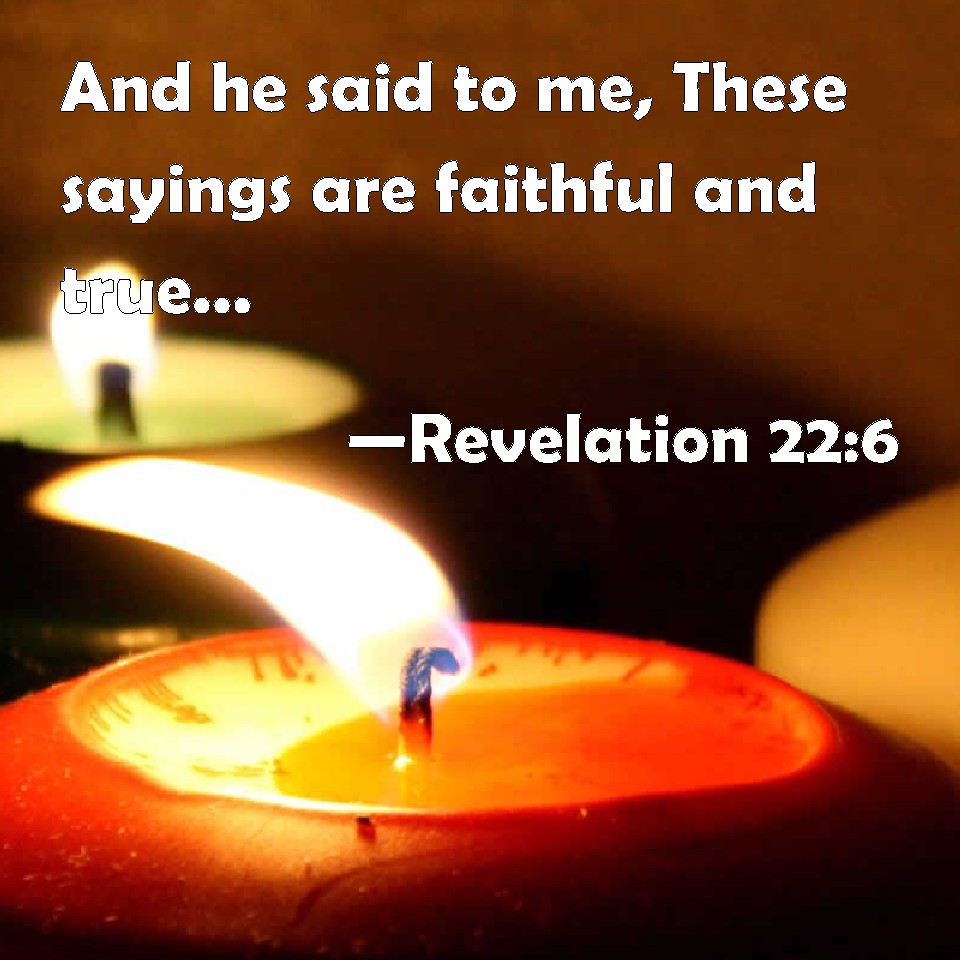 Choose a Background Revelation 22:6 And he said to me, These sayings are faithful and true: and the Lord God of the holy prophets sent his angel to show to his servants the things which must shortly be done. KJV: And he said unto me, These sayings are faithful and true: and the Lord God of the holy prophets sent his angel to shew unto his servants the things which must shortly be done. DRB: And he said to me: These words are most faithful and true. And the Lord God of the spirits of the prophets sent his angel to shew his servants the things which must be done shortly. DBT: And he said to me, These words are faithful and true; and the Lord God of the spirits of the prophets has sent his angel to shew to his bondmen the things which must soon come to pass. ERV: And he said unto me, These words are faithful and true: and the Lord, the God of the spirits of the prophets, sent his angel to shew unto his servants the things which must shortly come to pass. WBT: And he said to me, These sayings are faithful and true. And the Lord God of the holy prophets sent his angel to show to his servants the things which must shortly be done. WEB: He said to me, "These words are faithful and true. The Lord God of the spirits of the prophets sent his angel to show to his bondservants the things which must happen soon." YLT: And he said to me, 'These words are stedfast and true, and the Lord God of the holy prophets did send His messenger to shew to His servants the things that it behoveth to come quickly:Links Revelation 22:6 NIV • Revelation 22:6 NLT • Revelation 22:6 ESV • Revelation 22:6 NASB • Revelation 22:6 KJV • Revelation 22:6 Interlinear • Revelation 22:6 Commentaries • Revelation 22:6 Parallel Texts • Revelation 22:6 Bible Apps • Revelation 22:6 Parallel • Bible Hub |