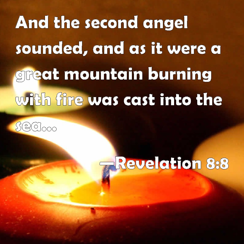 Choose a Background Revelation 8:8 And the second angel sounded, and as it were a great mountain burning with fire was cast into the sea: and the third part of the sea became blood; KJV: And the second angel sounded, and as it were a great mountain burning with fire was cast into the sea: and the third part of the sea became blood; DRB: And the second angel sounded the trumpet: and as it were a great mountain, burning with fire, was cast into the sea, and the third part of the sea became blood: DBT: And the second angel sounded his trumpet: and as a great mountain burning with fire was cast into the sea, and the third part of the sea became blood; ERV: And the second angel sounded, and as it were a great mountain burning with fire was cast into the sea: and the third part of the sea became blood; WBT: And the second angel sounded, and as it were a great mountain burning with fire was cast into the sea: and the third part of the sea became blood; WEB: The second angel sounded, and something like a great burning mountain was thrown into the sea. One third of the sea became blood, YLT: And the second messenger did sound, and as it were a great mountain with fire burning was cast into the sea, and the third of the sea became blood,Links Revelation 8:8 NIV • Revelation 8:8 NLT • Revelation 8:8 ESV • Revelation 8:8 NASB • Revelation 8:8 KJV • Revelation 8:8 Interlinear • Revelation 8:8 Commentaries • Revelation 8:8 Parallel Texts • Revelation 8:8 Bible Apps • Revelation 8:8 Parallel • Bible Hub |