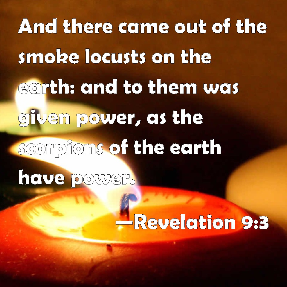 Choose a Background Revelation 9:3 And there came out of the smoke locusts on the earth: and to them was given power, as the scorpions of the earth have power. KJV: And there came out of the smoke locusts upon the earth: and unto them was given power, as the scorpions of the earth have power. DRB: And from the smoke of the pit there came out locusts upon the earth. And power was given to them, as the scorpions of the earth have power: DBT: And out of the smoke came forth locusts on the earth, and power was given to them as the scorpions of the earth have power; ERV: And out of the smoke came forth locusts upon the earth; and power was given them, as the scorpions of the earth have power. WBT: And there came out of the smoke locusts upon the earth: and to them was given power, as the scorpions of the earth have power. WEB: Then out of the smoke came forth locusts on the earth, and power was given to them, as the scorpions of the earth have power. YLT: And out of the smoke came forth locusts to the earth, and there was given to them authority, as scorpions of the earth have authority,Links Revelation 9:3 NIV • Revelation 9:3 NLT • Revelation 9:3 ESV • Revelation 9:3 NASB • Revelation 9:3 KJV • Revelation 9:3 Interlinear • Revelation 9:3 Commentaries • Revelation 9:3 Parallel Texts • Revelation 9:3 Bible Apps • Revelation 9:3 Parallel • Bible Hub |