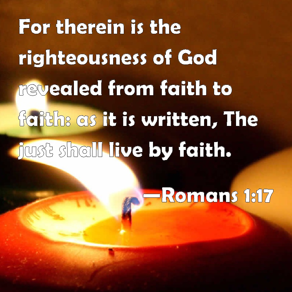Choose a Background Romans 1:17 For therein is the righteousness of God revealed from faith to faith: as it is written, The just shall live by faith. KJV: For therein is the righteousness of God revealed from faith to faith: as it is written, The just shall live by faith. DRB: For the justice of God is revealed therein, from faith unto faith, as it is written: The just man liveth by faith. DBT: for righteousness of God is revealed therein, on the principle of faith, to faith: according as it is written, But the just shall live by faith. ERV: For therein is revealed a righteousness of God by faith unto faith: as it is written, But the righteous shall live by faith. WBT: For in this is the righteousness of God revealed from faith to faith: as it is written, The just shall live by faith. WEB: For in it is revealed God's righteousness from faith to faith. As it is written, "But the righteous shall live by faith." YLT: For the righteousness of God in it is revealed from faith to faith, according as it hath been written, 'And the righteous one by faith shall live,'Links Romans 1:17 NIV • Romans 1:17 NLT • Romans 1:17 ESV • Romans 1:17 NASB • Romans 1:17 KJV • Romans 1:17 Interlinear • Romans 1:17 Commentaries • Romans 1:17 Parallel Texts • Romans 1:17 Bible Apps • Romans 1:17 Parallel • Bible Hub |