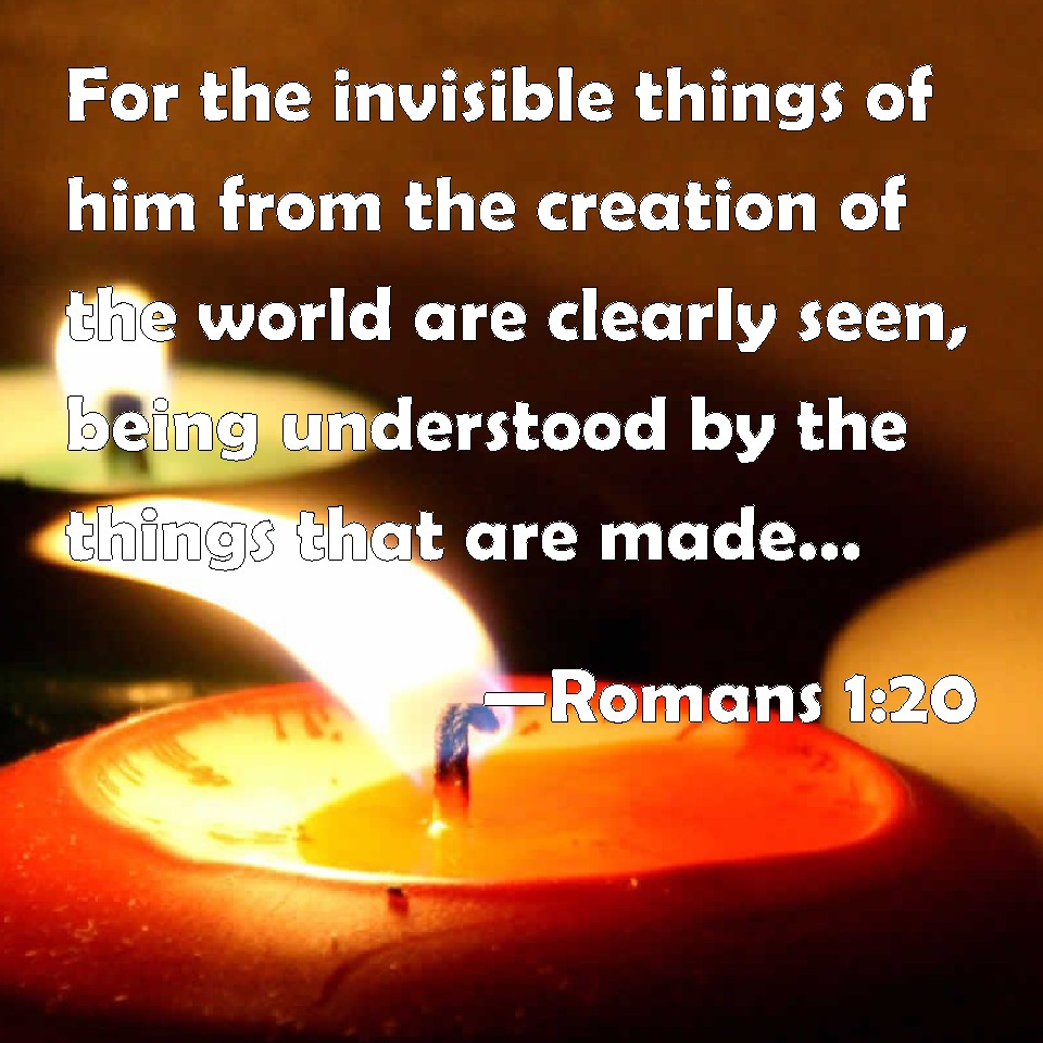 Choose a Background Romans 1:20 For the invisible things of him from the creation of the world are clearly seen, being understood by the things that are made, even his eternal power and Godhead; so that they are without excuse: KJV: For the invisible things of him from the creation of the world are clearly seen, being understood by the things that are made, even his eternal power and Godhead; so that they are without excuse: DRB: For the invisible things of him, from the creation of the world, are clearly seen, being understood by the things that are made; his eternal power also, and divinity: so that they are inexcusable. DBT: for from the world's creation the invisible things of him are perceived, being apprehended by the mind through the things that are made, both his eternal power and divinity, so as to render them inexcusable. ERV: For the invisible things of him since the creation of the world are clearly seen, being perceived through the things that are made, even his everlasting power and divinity; that they may be without excuse: WBT: For the invisible things of him from the creation of the world are clearly seen, being understood by the things that are made, even his eternal power and Godhead; so that they are without excuse: WEB: For the invisible things of him since the creation of the world are clearly seen, being perceived through the things that are made, even his everlasting power and divinity; that they may be without excuse. YLT: for the invisible things of Him from the creation of the world, by the things made being understood, are plainly seen, both His eternal power and Godhead — to their being inexcusable;Links Romans 1:20 NIV • Romans 1:20 NLT • Romans 1:20 ESV • Romans 1:20 NASB • Romans 1:20 KJV • Romans 1:20 Interlinear • Romans 1:20 Commentaries • Romans 1:20 Parallel Texts • Romans 1:20 Bible Apps • Romans 1:20 Parallel • Bible Hub |