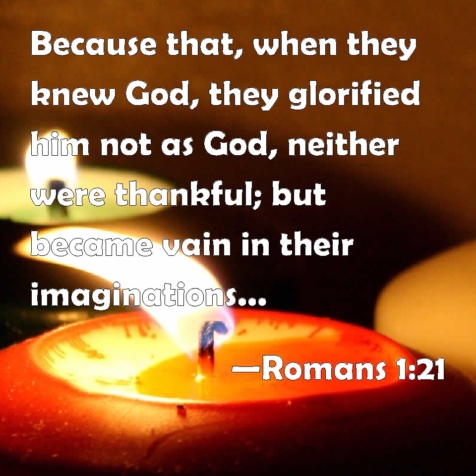 Romans 1:21 Because that, when they knew God, they glorified him not as God, neither were thankful; but became vain in their imaginations, and their foolish heart was darkened.