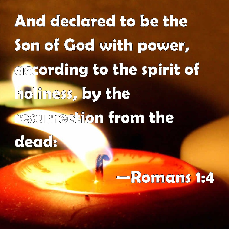 Choose a Background Romans 1:4 And declared to be the Son of God with power, according to the spirit of holiness, by the resurrection from the dead: KJV: And declared to be the Son of God with power, according to the spirit of holiness, by the resurrection from the dead: DRB: Who was predestinated the Son of God in power, according to the spirit of sanctification, by the resurrection of our Lord Jesus Christ from the dead; DBT: marked out Son of God in power, according to the Spirit of holiness, by resurrection of the dead) Jesus Christ our Lord; ERV: who was declared to be the Son of God with power, according to the spirit of holiness, by the resurrection of the dead; even Jesus Christ our Lord, WBT: And declared to be the Son of God, with power, according to the spirit of holiness, by the resurrection from the dead: WEB: who was declared to be the Son of God with power, according to the Spirit of holiness, by the resurrection from the dead, Jesus Christ our Lord, YLT: who is marked out Son of God in power, according to the Spirit of sanctification, by the rising again from the dead,) Jesus Christ our Lord;Links Romans 1:4 NIV • Romans 1:4 NLT • Romans 1:4 ESV • Romans 1:4 NASB • Romans 1:4 KJV • Romans 1:4 Interlinear • Romans 1:4 Commentaries • Romans 1:4 Parallel Texts • Romans 1:4 Bible Apps • Romans 1:4 Parallel • Bible Hub |