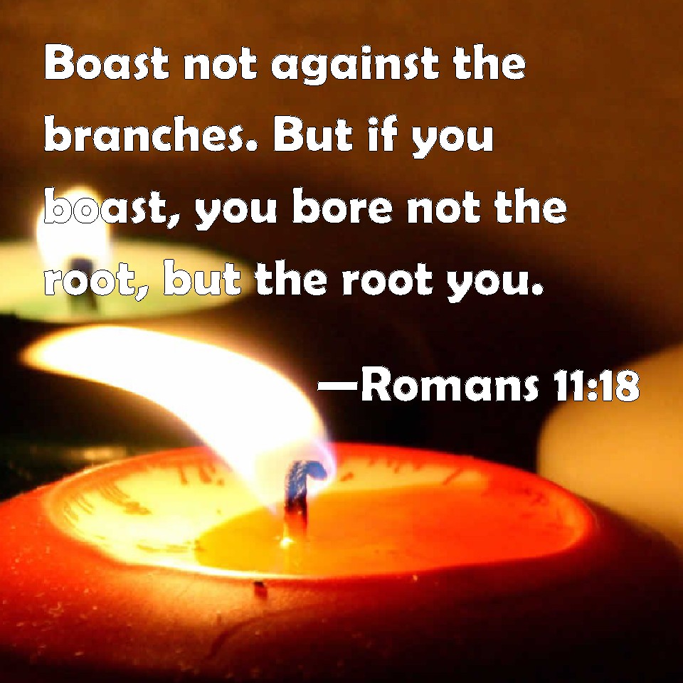 Choose a Background Romans 11:18 Boast not against the branches. But if you boast, you bore not the root, but the root you. KJV: Boast not against the branches. But if thou boast, thou bearest not the root, but the root thee. DRB: Boast not against the branches. But if thou boast, thou bearest not the root, but the root thee. DBT: boast not against the branches; but if thou boast, it is not thou bearest the root, but the root thee. ERV: glory not over the branches: but if thou gloriest, it is not thou that bearest the root, but the root thee. WBT: Boast not against the branches. But if thou boastest, thou bearest not the root, but the root thee. WEB: don't boast over the branches. But if you boast, it is not you who support the root, but the root supports you. YLT: do not boast against the branches; and if thou dost boast, thou dost not bear the root, but the root thee!Links Romans 11:18 NIV • Romans 11:18 NLT • Romans 11:18 ESV • Romans 11:18 NASB • Romans 11:18 KJV • Romans 11:18 Interlinear • Romans 11:18 Commentaries • Romans 11:18 Parallel Texts • Romans 11:18 Bible Apps • Romans 11:18 Parallel • Bible Hub |