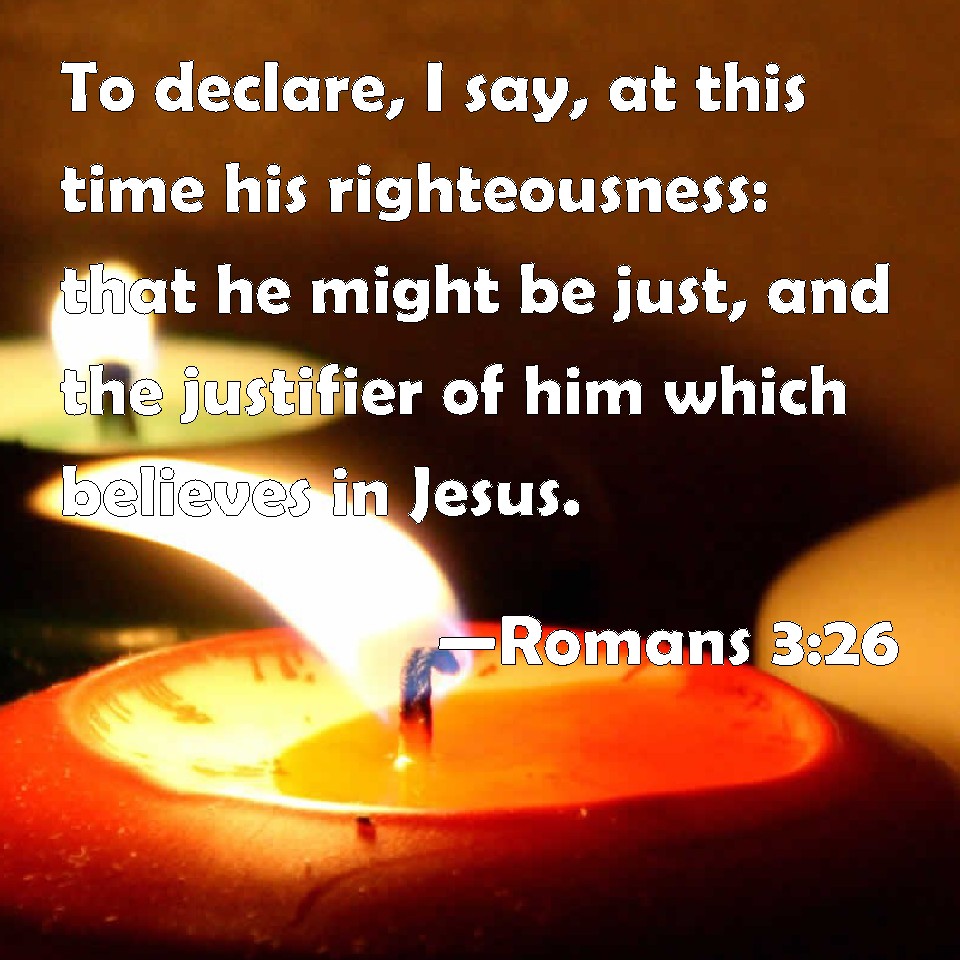 Choose a Background Romans 3:26 To declare, I say, at this time his righteousness: that he might be just, and the justifier of him which believes in Jesus. KJV: To declare, I say, at this time his righteousness: that he might be just, and the justifier of him which believeth in Jesus. DRB: Through the forbearance of God, for the shewing of his justice in this time; that he himself may be just, and the justifier of him, who is of the faith of Jesus Christ. DBT: for the shewing forth of his righteousness in the present time, so that he should be just, and justify him that is of the faith of Jesus. ERV: for the shewing, I say, of his righteousness at this present season: that he might himself be just, and the justifier of him that hath faith in Jesus. WBT: To declare, I say, at this time his righteousness: that he may be just, and the justifier of him who believeth in Jesus. WEB: to demonstrate his righteousness at this present time; that he might himself be just, and the justifier of him who has faith in Jesus. YLT: for the shewing forth of His righteousness in the present time, for His being righteous, and declaring him righteous who is of the faith of Jesus.Links Romans 3:26 NIV • Romans 3:26 NLT • Romans 3:26 ESV • Romans 3:26 NASB • Romans 3:26 KJV • Romans 3:26 Interlinear • Romans 3:26 Commentaries • Romans 3:26 Parallel Texts • Romans 3:26 Bible Apps • Romans 3:26 Parallel • Bible Hub |