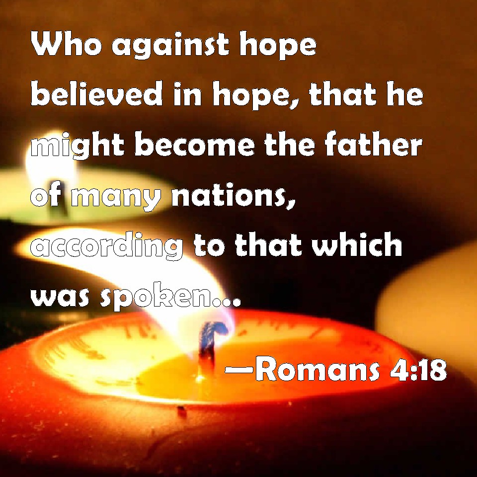 Choose a Background Romans 4:18 Who against hope believed in hope, that he might become the father of many nations, according to that which was spoken, So shall your seed be. KJV: Who against hope believed in hope, that he might become the father of many nations; according to that which was spoken, So shall thy seed be. DRB: Who against hope believed in hope; that he might be made the father of many nations, according to that which was said to him: So shall thy seed be. DBT: who against hope believed in hope to his becoming father of many nations, according to that which was spoken, So shall thy seed be: ERV: Who in hope believed against hope, to the end that he might become a father of many nations, according to that which had been spoken, So shall thy seed be. WBT: Who against hope believed with hope, that he should become the father of many nations; according to that which was spoken, So shall thy seed be. WEB: Who in hope believed against hope, to the end that he might become a father of many nations, according to that which had been spoken, "So will your seed be." YLT: Who, against hope in hope did believe, for his becoming father of many nations according to that spoken: 'So shall thy seed be;'Links Romans 4:18 NIV • Romans 4:18 NLT • Romans 4:18 ESV • Romans 4:18 NASB • Romans 4:18 KJV • Romans 4:18 Interlinear • Romans 4:18 Commentaries • Romans 4:18 Parallel Texts • Romans 4:18 Bible Apps • Romans 4:18 Parallel • Bible Hub |