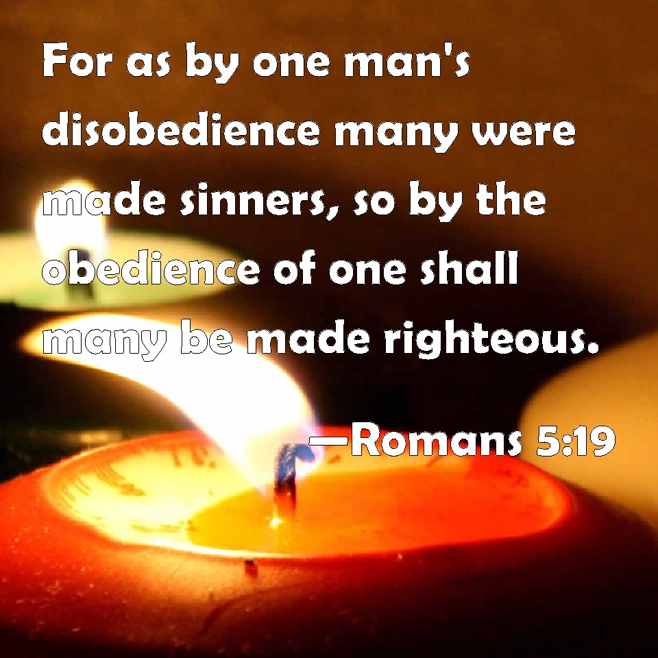 Choose a Background Romans 5:19 For as by one man's disobedience many were made sinners, so by the obedience of one shall many be made righteous. KJV: For as by one man's disobedience many were made sinners, so by the obedience of one shall many be made righteous. DRB: For as by the disobedience of one man, many were made sinners; so also by the obedience of one, many shall be made just. DBT: For as indeed by the disobedience of the one man the many have been constituted sinners, so also by the obedience of the one the many will be constituted righteous. ERV: For as through the one man's disobedience the many were made sinners, even so through the obedience of the one shall the many be made righteous. WBT: For as by one man's disobedience many were made sinners, so by the obedience of one shall many be made righteous. WEB: For as through the one man's disobedience many were made sinners, even so through the obedience of the one, many will be made righteous. YLT: for as through the disobedience of the one man, the many were constituted sinners: so also through the obedience of the one, shall the many be constituted righteous.Links Romans 5:19 NIV • Romans 5:19 NLT • Romans 5:19 ESV • Romans 5:19 NASB • Romans 5:19 KJV • Romans 5:19 Interlinear • Romans 5:19 Commentaries • Romans 5:19 Parallel Texts • Romans 5:19 Bible Apps • Romans 5:19 Parallel • Bible Hub |