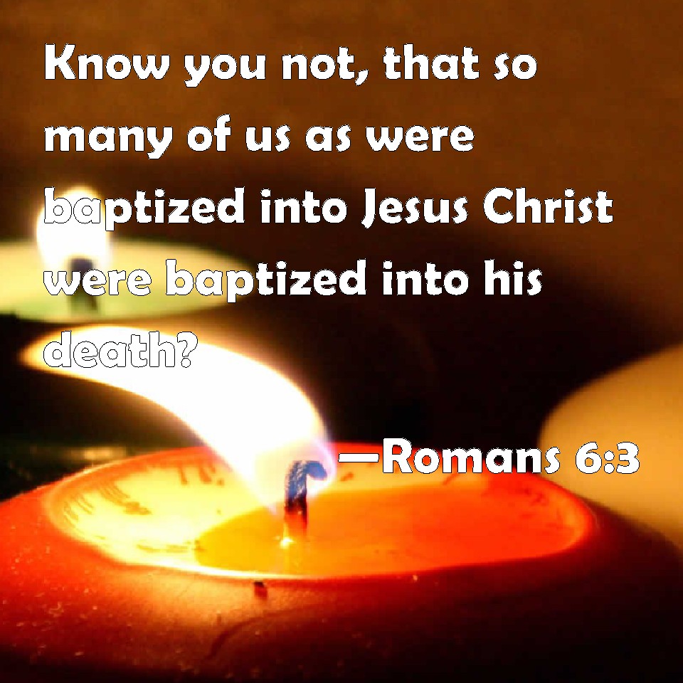 Choose a Background Romans 6:3 Know you not, that so many of us as were baptized into Jesus Christ were baptized into his death? KJV: Know ye not, that so many of us as were baptized into Jesus Christ were baptized into his death? DRB: Know you not that all we, who are baptized in Christ Jesus, are baptized in his death? DBT: Are you ignorant that we, as many as have been baptised unto Christ Jesus, have been baptised unto his death? ERV: Or are ye ignorant that all we who were baptized into Christ Jesus were baptized into his death? WBT: Know ye not, that so many of us as were baptized into Jesus Christ, were baptized into his death? WEB: Or don't you know that all we who were baptized into Christ Jesus were baptized into his death? YLT: are ye ignorant that we, as many as were baptized to Christ Jesus, to his death were baptized?Links Romans 6:3 NIV • Romans 6:3 NLT • Romans 6:3 ESV • Romans 6:3 NASB • Romans 6:3 KJV • Romans 6:3 Interlinear • Romans 6:3 Commentaries • Romans 6:3 Parallel Texts • Romans 6:3 Bible Apps • Romans 6:3 Parallel • Bible Hub |