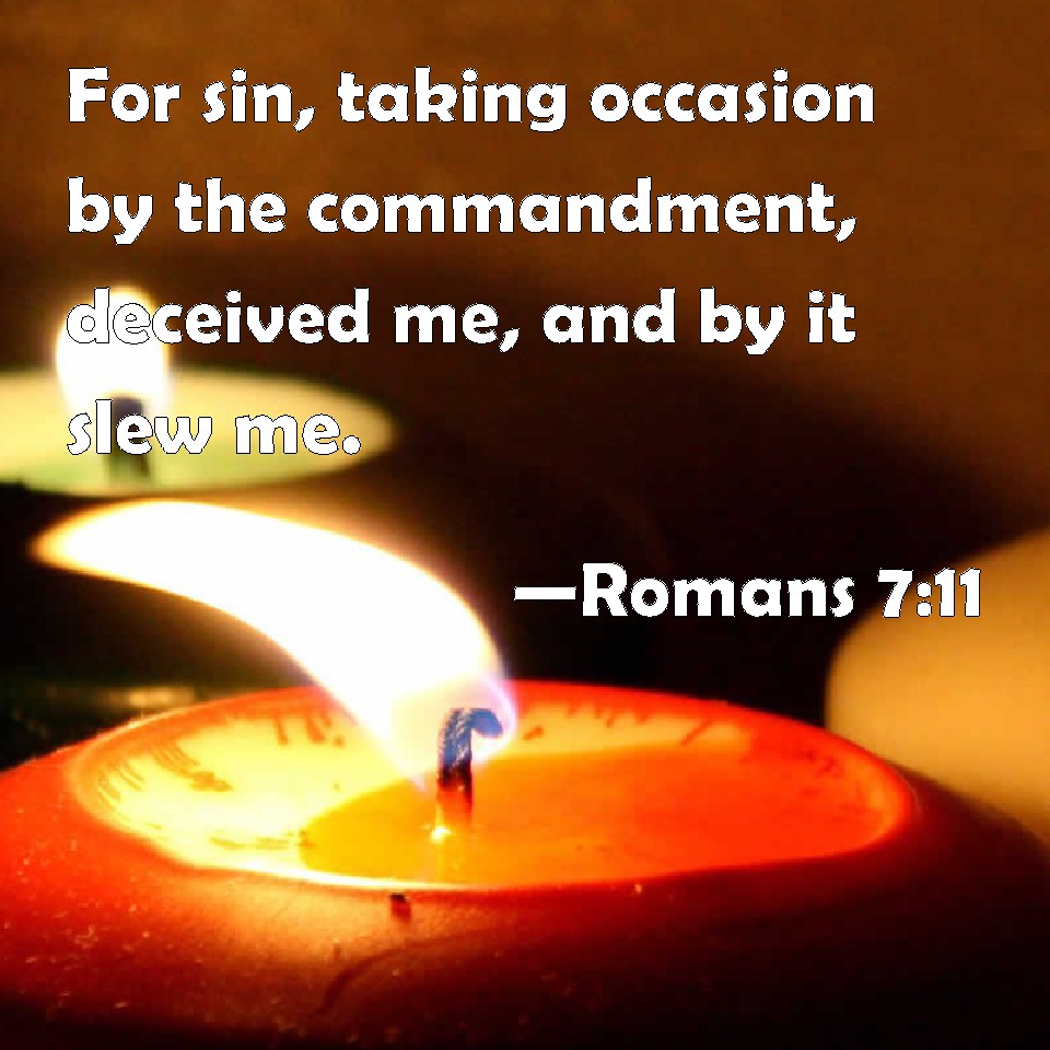 Choose a Background Romans 7:11 For sin, taking occasion by the commandment, deceived me, and by it slew me. KJV: For sin, taking occasion by the commandment, deceived me, and by it slew me. DRB: For sin, taking occasion by the commandment, seduced me, and by it killed me. DBT: for sin, getting a point of attack by the commandment, deceived me, and by it slew me. ERV: for sin, finding occasion, through the commandment beguiled me, and through it slew me. WBT: For sin, taking occasion by the commandment, deceived me, and by it slew me. WEB: for sin, finding occasion through the commandment, deceived me, and through it killed me. YLT: for the sin, having received an opportunity, through the command, did deceive me, and through it did slay me;Links Romans 7:11 NIV • Romans 7:11 NLT • Romans 7:11 ESV • Romans 7:11 NASB • Romans 7:11 KJV • Romans 7:11 Interlinear • Romans 7:11 Commentaries • Romans 7:11 Parallel Texts • Romans 7:11 Bible Apps • Romans 7:11 Parallel • Bible Hub |