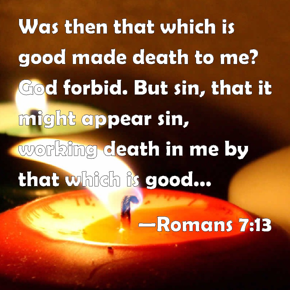 Choose a Background Romans 7:13 Was then that which is good made death to me? God forbid. But sin, that it might appear sin, working death in me by that which is good; that sin by the commandment might become exceeding sinful. KJV: Was then that which is good made death unto me? God forbid. But sin, that it might appear sin, working death in me by that which is good; that sin by the commandment might become exceeding sinful. DRB: Was that then which is good, made death unto me? God forbid. But sin, that it may appear sin, by that which is good, wrought death in me; that sin, by the commandment, might become sinful above measure. DBT: Did then that which is good become death to me? Far be the thought. But sin, that it might appear sin, working death to me by that which is good; in order that sin by the commandment might become exceeding sinful. ERV: Did then that which is good become death unto me? God forbid. But sin, that it might be shewn to be sin, by working death to me through that which is good;—that through the commandment sin might become exceeding sinful. WBT: Was then that which is good made death to me? By no means. But sin, that it might appear sin, working death in me by that which is good; that sin by the commandment might become exceeding sinful. WEB: Did then that which is good become death to me? May it never be! But sin, that it might be shown to be sin, by working death to me through that which is good; that through the commandment sin might become exceeding sinful. YLT: That which is good then, to me hath it become death? let it not be! but the sin, that it might appear sin, through the good, working death to me, that the sin might become exceeding sinful through the command,Links Romans 7:13 NIV • Romans 7:13 NLT • Romans 7:13 ESV • Romans 7:13 NASB • Romans 7:13 KJV • Romans 7:13 Interlinear • Romans 7:13 Commentaries • Romans 7:13 Parallel Texts • Romans 7:13 Bible Apps • Romans 7:13 Parallel • Bible Hub |