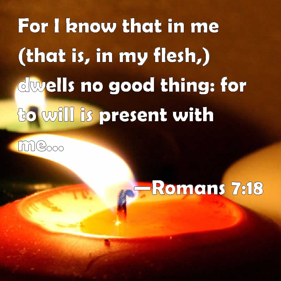 Choose a Background Romans 7:18 For I know that in me (that is, in my flesh,) dwells no good thing: for to will is present with me; but how to perform that which is good I find not. KJV: For I know that in me (that is, in my flesh,) dwelleth no good thing: for to will is present with me; but how to perform that which is good I find not. DRB: For I know that there dwelleth not in me, that is to say, in my flesh, that which is good. For to will, is present with me; but to accomplish that which is good, I find not. DBT: For I know that in me, that is, in my flesh, good does not dwell: for to will is there with me, but to do right I find not. ERV: For I know that in me, that is, in my flesh, dwelleth no good thing: for to will is present with me, but to do that which is good is not. WBT: For I know that in me (that is, in my flesh,) dwelleth no good thing: for to will is present with me; but how to perform that which is good, I find not. WEB: For I know that in me, that is, in my flesh, dwells no good thing. For desire is present with me, but I don't find it doing that which is good. YLT: for I have known that there doth not dwell in me, that is, in my flesh, good: for to will is present with me, and to work that which is right I do not find,Links Romans 7:18 NIV • Romans 7:18 NLT • Romans 7:18 ESV • Romans 7:18 NASB • Romans 7:18 KJV • Romans 7:18 Interlinear • Romans 7:18 Commentaries • Romans 7:18 Parallel Texts • Romans 7:18 Bible Apps • Romans 7:18 Parallel • Bible Hub |