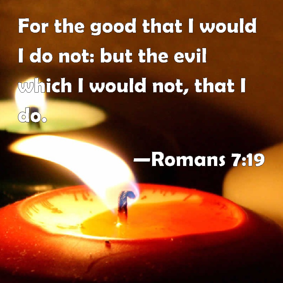 Choose a Background Romans 7:19 For the good that I would I do not: but the evil which I would not, that I do. KJV: For the good that I would I do not: but the evil which I would not, that I do. DRB: For the good which I will, I do not; but the evil which I will not, that I do. DBT: For I do not practise the good that I will; but the evil I do not will, that I do. ERV: For the good which I would I do not: but the evil which I would not, that I practise. WBT: For the good that I would, I do not; but the evil which I would not, that I do. WEB: For the good which I desire, I don't do; but the evil which I don't desire, that I practice. YLT: for the good that I will, I do not; but the evil that I do not will, this I practise.Links Romans 7:19 NIV • Romans 7:19 NLT • Romans 7:19 ESV • Romans 7:19 NASB • Romans 7:19 KJV • Romans 7:19 Interlinear • Romans 7:19 Commentaries • Romans 7:19 Parallel Texts • Romans 7:19 Bible Apps • Romans 7:19 Parallel • Bible Hub |