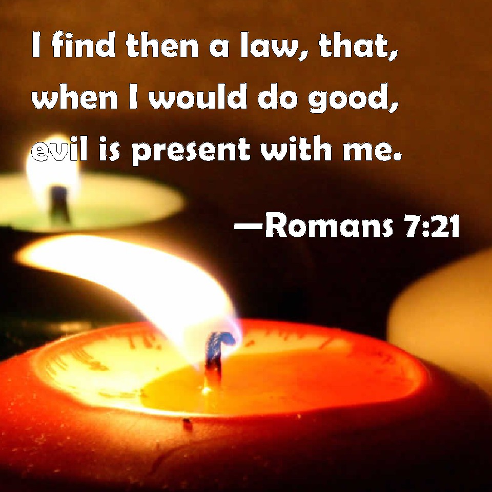 Choose a Background Romans 7:21 I find then a law, that, when I would do good, evil is present with me. KJV: I find then a law, that, when I would do good, evil is present with me. DRB: I find then a law, that when I have a will to do good, evil is present with me. DBT: I find then the law upon me who will to practise what is right, that with me evil is there. ERV: I find then the law, that, to me who would do good, evil is present. WBT: I find then a law, that when I would do good, evil is present with me. WEB: I find then the law, that, to me, while I desire to do good, evil is present. YLT: I find, then, the law, that when I desire to do what is right, with me the evil is present,Links Romans 7:21 NIV • Romans 7:21 NLT • Romans 7:21 ESV • Romans 7:21 NASB • Romans 7:21 KJV • Romans 7:21 Interlinear • Romans 7:21 Commentaries • Romans 7:21 Parallel Texts • Romans 7:21 Bible Apps • Romans 7:21 Parallel • Bible Hub |