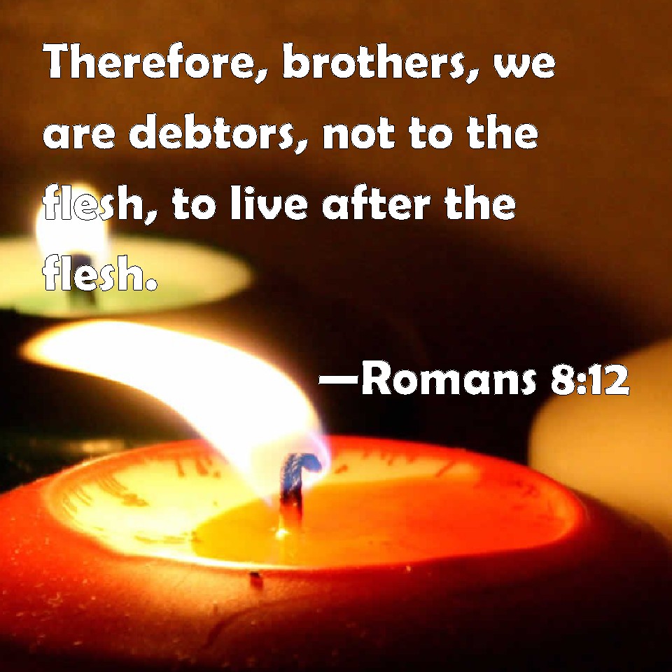 Choose a Background Romans 8:12 Therefore, brothers, we are debtors, not to the flesh, to live after the flesh. KJV: Therefore, brethren, we are debtors, not to the flesh, to live after the flesh. DRB: Therefore, brethren, we are debtors, not to the flesh, to live according to the flesh. DBT: So then, brethren, we are debtors, not to the flesh, to live according to flesh; ERV: So then, brethren, we are debtors, not to the flesh, to live after the flesh: WBT: Therefore, brethren, we are debtors, not to the flesh, to live according to the flesh. WEB: So then, brothers, we are debtors, not to the flesh, to live after the flesh. YLT: So, then, brethren, we are debtors, not to the flesh, to live according to the flesh;Links Romans 8:12 NIV • Romans 8:12 NLT • Romans 8:12 ESV • Romans 8:12 NASB • Romans 8:12 KJV • Romans 8:12 Interlinear • Romans 8:12 Commentaries • Romans 8:12 Parallel Texts • Romans 8:12 Bible Apps • Romans 8:12 Parallel • Bible Hub |