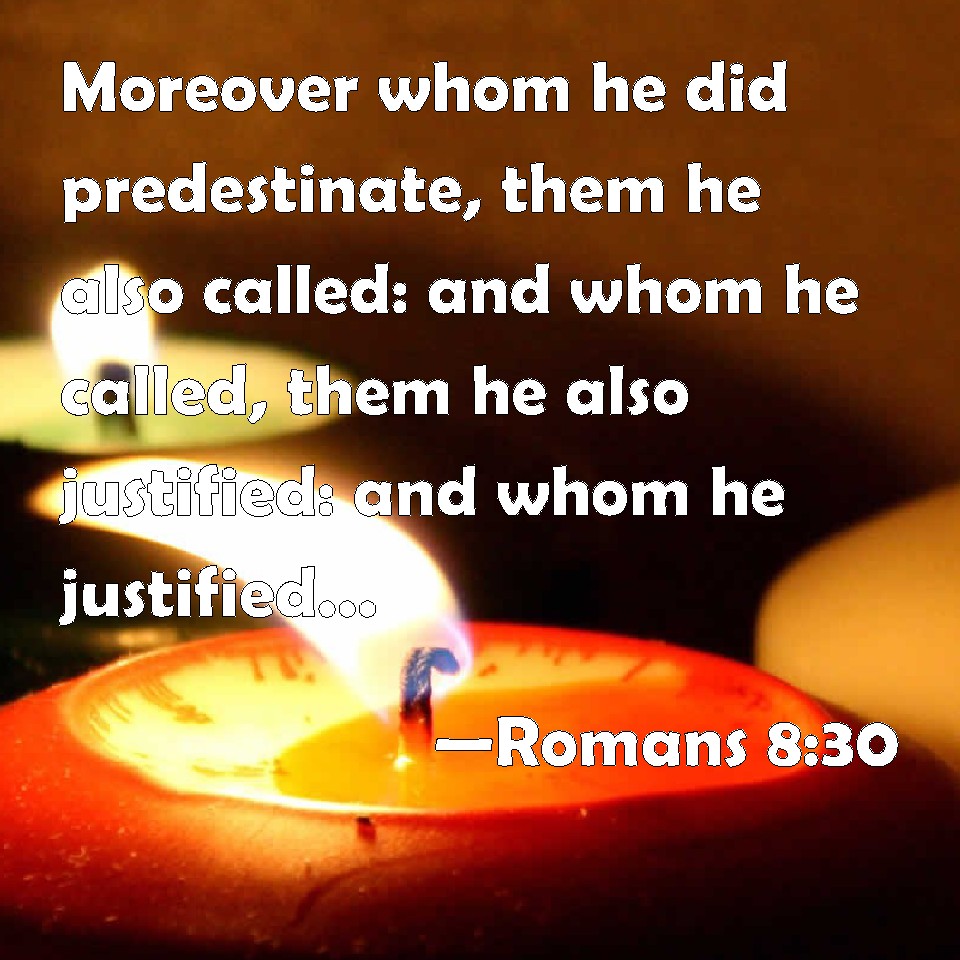 Choose a Background Romans 8:30 Moreover whom he did predestinate, them he also called: and whom he called, them he also justified: and whom he justified, them he also glorified. KJV: Moreover whom he did predestinate, them he also called: and whom he called, them he also justified: and whom he justified, them he also glorified. DRB: And whom he predestinated, them he also called. And whom he called, them he also justified. And whom he justified, them he also glorified. DBT: But whom he has predestinated, these also he has called; and whom he has called, these also he has justified; but whom he has justified, these also he has glorified. ERV: and whom he foreordained, them he also called: and whom he called, them he also justified: and whom he justified, them he also glorified. WBT: Moreover, whom he did predestinate, them he also called: and whom he called, them he also justified: and whom he justified, them he also glorified. WEB: Whom he predestined, those he also called. Whom he called, those he also justified. Whom he justified, those he also glorified. YLT: and whom He did fore-appoint, these also He did call; and whom He did call, these also He declared righteous; and whom He declared righteous, these also He did glorify.Links Romans 8:30 NIV • Romans 8:30 NLT • Romans 8:30 ESV • Romans 8:30 NASB • Romans 8:30 KJV • Romans 8:30 Interlinear • Romans 8:30 Commentaries • Romans 8:30 Parallel Texts • Romans 8:30 Bible Apps • Romans 8:30 Parallel • Bible Hub |