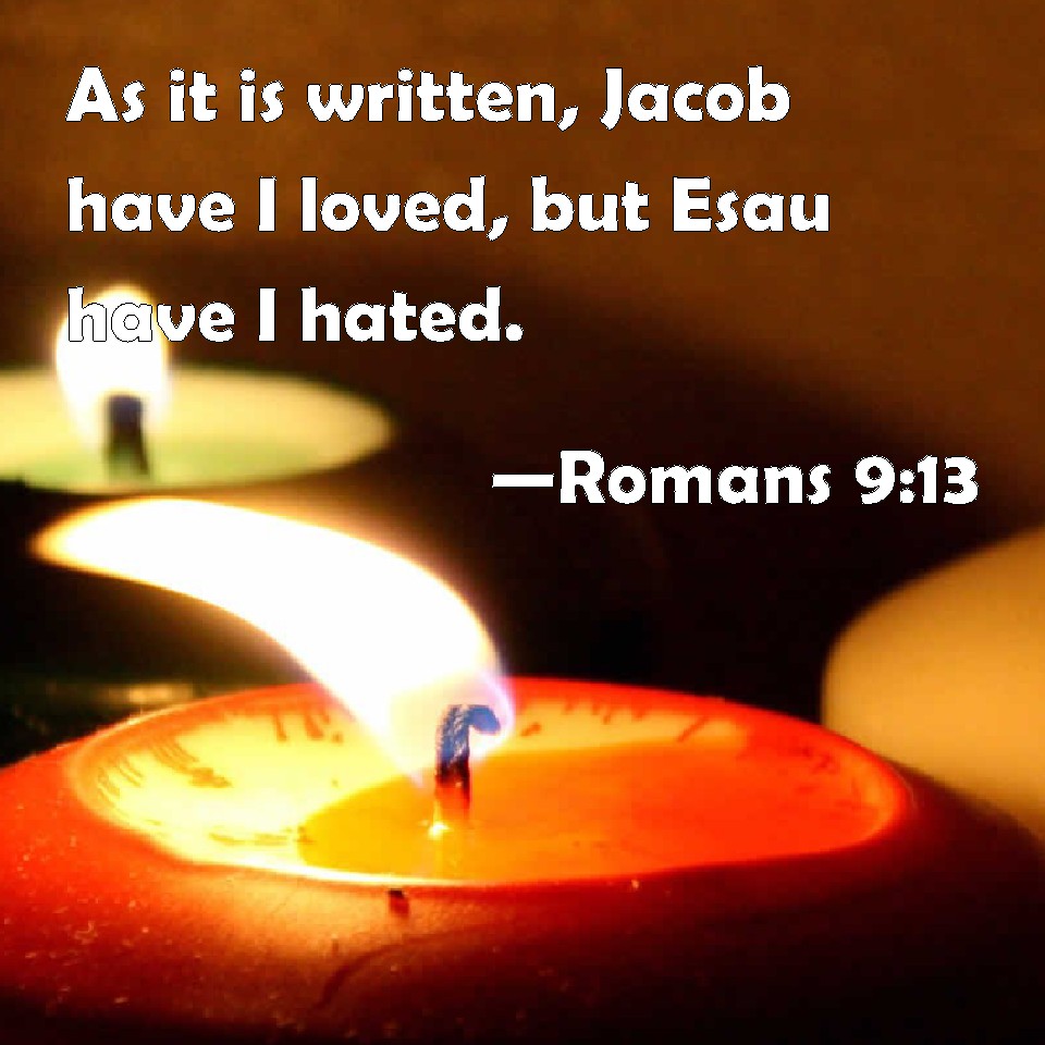 Choose a Background Romans 9:13 As it is written, Jacob have I loved, but Esau have I hated. KJV: As it is written, Jacob have I loved, but Esau have I hated. DRB: As it is written: Jacob I have loved, but Esau I have hated. DBT: according as it is written, I have loved Jacob, and I have hated Esau. ERV: Even as it is written, Jacob I loved, but Esau I hated. WBT: As it is written, Jacob have I loved, but Esau have I hated. WEB: Even as it is written, "Jacob I loved, but Esau I hated." YLT: according as it hath been written, 'Jacob I did love, and Esau I did hate.'Links Romans 9:13 NIV • Romans 9:13 NLT • Romans 9:13 ESV • Romans 9:13 NASB • Romans 9:13 KJV • Romans 9:13 Interlinear • Romans 9:13 Commentaries • Romans 9:13 Parallel Texts • Romans 9:13 Bible Apps • Romans 9:13 Parallel • Bible Hub |