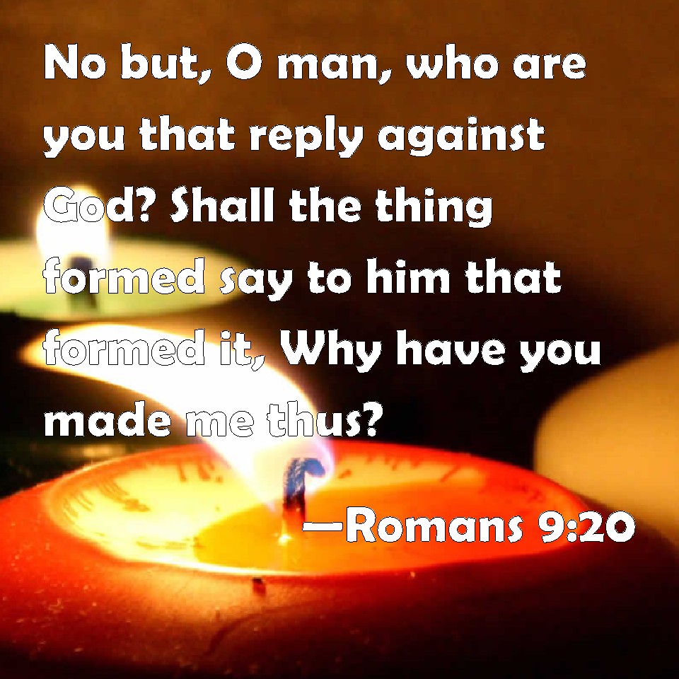 Choose a Background Romans 9:20 No but, O man, who are you that reply against God? Shall the thing formed say to him that formed it, Why have you made me thus? KJV: Nay but, O man, who art thou that repliest against God? Shall the thing formed say to him that formed it, Why hast thou made me thus? DRB: O man, who art thou that repliest against God? Shall the thing formed say to him that formed it: Why hast thou made me thus? DBT: Aye, but thou, O man, who art thou that answerest again to God? Shall the thing formed say to him that has formed it, Why hast thou made me thus? ERV: Nay but, O man, who art thou that repliest against God? Shall the thing formed say to him that formed it, Why didst thou make me thus? WBT: No, but, O man, who art thou that repliest against God? shall the thing formed say to him that formed it, Why hast thou made me thus? WEB: But indeed, O man, who are you to reply against God? Will the thing formed ask him who formed it, "Why did you make me like this?" YLT: nay, but, O man, who art thou that art answering again to God? shall the thing formed say to Him who did form it, Why me didst thou make thus?Links Romans 9:20 NIV • Romans 9:20 NLT • Romans 9:20 ESV • Romans 9:20 NASB • Romans 9:20 KJV • Romans 9:20 Interlinear • Romans 9:20 Commentaries • Romans 9:20 Parallel Texts • Romans 9:20 Bible Apps • Romans 9:20 Parallel • Bible Hub |