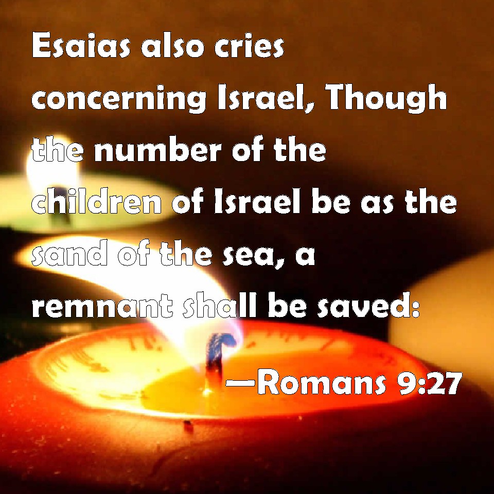 Choose a Background Romans 9:27 Esaias also cries concerning Israel, Though the number of the children of Israel be as the sand of the sea, a remnant shall be saved: KJV: Esaias also crieth concerning Israel, Though the number of the children of Israel be as the sand of the sea, a remnant shall be saved: DRB: And Isaias crieth out concerning Israel: If the number of the children of Israel be as the sand of the sea, a remnant shall be saved. DBT: But Esaias cries concerning Israel, Should the number of the children of Israel be as the sand of the sea, the remnant shall be saved: ERV: And Isaiah crieth concerning Israel, If the number of the children of Israel be as the sand of the sea, it is the remnant that shall be saved: WBT: Isaiah also crieth concerning Israel, Though the number of the children of Israel be as the sand of the sea, a remnant shall be saved: WEB: Isaiah cries concerning Israel, "If the number of the children of Israel are as the sand of the sea, it is the remnant who will be saved; YLT: And Isaiah doth cry concerning Israel, 'If the number of the sons of Israel may be as the sand of the sea, the remnant shall be saved;Links Romans 9:27 NIV • Romans 9:27 NLT • Romans 9:27 ESV • Romans 9:27 NASB • Romans 9:27 KJV • Romans 9:27 Interlinear • Romans 9:27 Commentaries • Romans 9:27 Parallel Texts • Romans 9:27 Bible Apps • Romans 9:27 Parallel • Bible Hub |