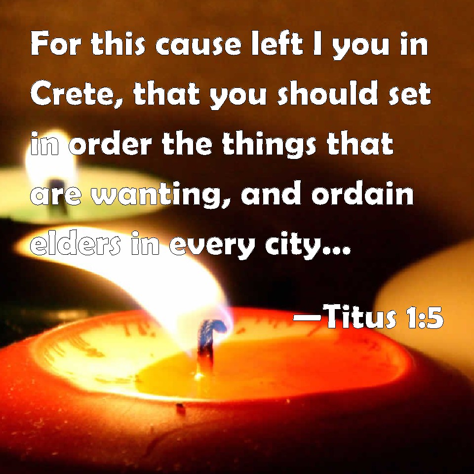 Choose a Background Titus 1:5 For this cause left I you in Crete, that you should set in order the things that are wanting, and ordain elders in every city, as I had appointed you: KJV: For this cause left I thee in Crete, that thou shouldest set in order the things that are wanting, and ordain elders in every city, as I had appointed thee: DRB: For this cause I left thee in Crete, that thou shouldest set in order the things that are wanting, and shouldest ordain priests in every city, as I also appointed thee: DBT: For this cause I left thee in Crete, that thou mightest go on to set right what remained unordered, and establish elders in each city, as I had ordered thee: ERV: For this cause left I thee in Crete, that thou shouldest set in order the things that were wanting, and appoint elders in every city, as I gave thee charge; WBT: For this cause I left thee in Crete, that thou shouldst set in order the things that are wanting, and ordain elders in every city, as I had appointed thee: WEB: I left you in Crete for this reason, that you would set in order the things that were lacking, and appoint elders in every city, as I directed you; YLT: For this cause left I thee in Crete, that the things lacking thou mayest arrange, and mayest set down in every city elders, as I did appoint to thee;Links Titus 1:5 NIV • Titus 1:5 NLT • Titus 1:5 ESV • Titus 1:5 NASB • Titus 1:5 KJV • Titus 1:5 Interlinear • Titus 1:5 Commentaries • Titus 1:5 Parallel Texts • Titus 1:5 Bible Apps • Titus 1:5 Parallel • Bible Hub |