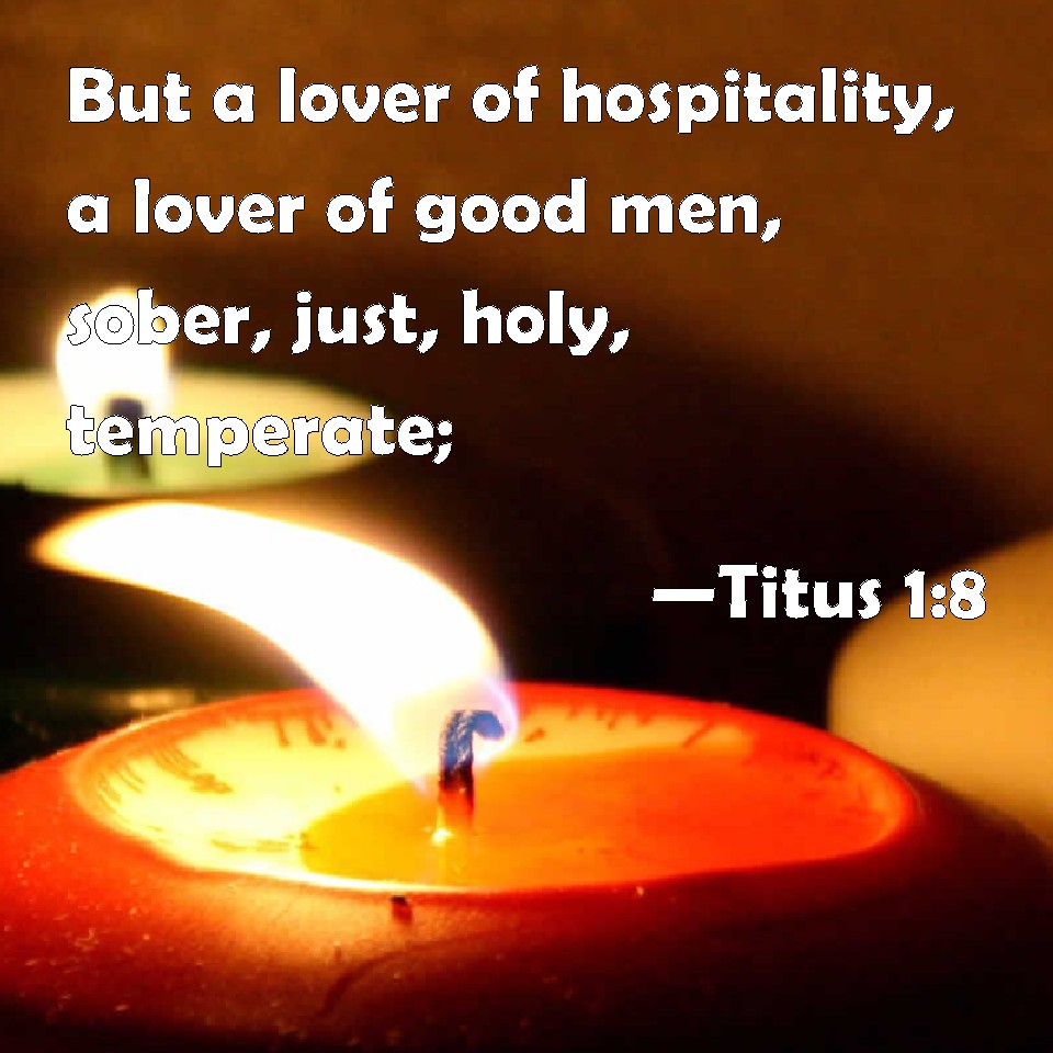 Choose a Background Titus 1:8 But a lover of hospitality, a lover of good men, sober, just, holy, temperate; KJV: But a lover of hospitality, a lover of good men, sober, just, holy, temperate; DRB: But given to hospitality, gentle, sober, just, holy, continent: DBT: but hospitable, a lover of goodness, discreet, just, pious, temperate, ERV: but given to hospitality, a lover of good, soberminded, just, holy, temperate; WBT: But a lover of hospitality, a lover of good men, sober, just, holy, temperate; WEB: but given to hospitality, a lover of good, sober minded, fair, holy, self-controlled; YLT: but a lover of strangers, a lover of good men, sober-minded, righteous, kind, self-controlled,Links Titus 1:8 NIV • Titus 1:8 NLT • Titus 1:8 ESV • Titus 1:8 NASB • Titus 1:8 KJV • Titus 1:8 Interlinear • Titus 1:8 Commentaries • Titus 1:8 Parallel Texts • Titus 1:8 Bible Apps • Titus 1:8 Parallel • Bible Hub |