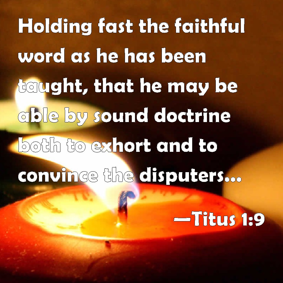 Choose a Background Titus 1:9 Holding fast the faithful word as he has been taught, that he may be able by sound doctrine both to exhort and to convince the disputers. KJV: Holding fast the faithful word as he hath been taught, that he may be able by sound doctrine both to exhort and to convince the gainsayers. DRB: Embracing that faithful word which is according to doctrine, that he may be able to exhort in sound doctrine, and to convince the gainsayers. DBT: clinging to the faithful word according to the doctrine taught, that he may be able both to encourage with sound teaching and refute gainsayers. ERV: holding to the faithful word which is according to the teaching, that he may be able both to exhort in the sound doctrine, and to convict the gainsayers. WBT: Holding fast the faithful word as he hath been taught, that he may be able by sound doctrine both to exhort and to convince the gainsayers. WEB: holding to the faithful word which is according to the teaching, that he may be able to exhort in the sound doctrine, and to convict those who contradict him. YLT: holding — according to the teaching — to the stedfast word, that he may be able also to exhort in the sound teaching, and the gainsayers to convict;Links Titus 1:9 NIV • Titus 1:9 NLT • Titus 1:9 ESV • Titus 1:9 NASB • Titus 1:9 KJV • Titus 1:9 Interlinear • Titus 1:9 Commentaries • Titus 1:9 Parallel Texts • Titus 1:9 Bible Apps • Titus 1:9 Parallel • Bible Hub |