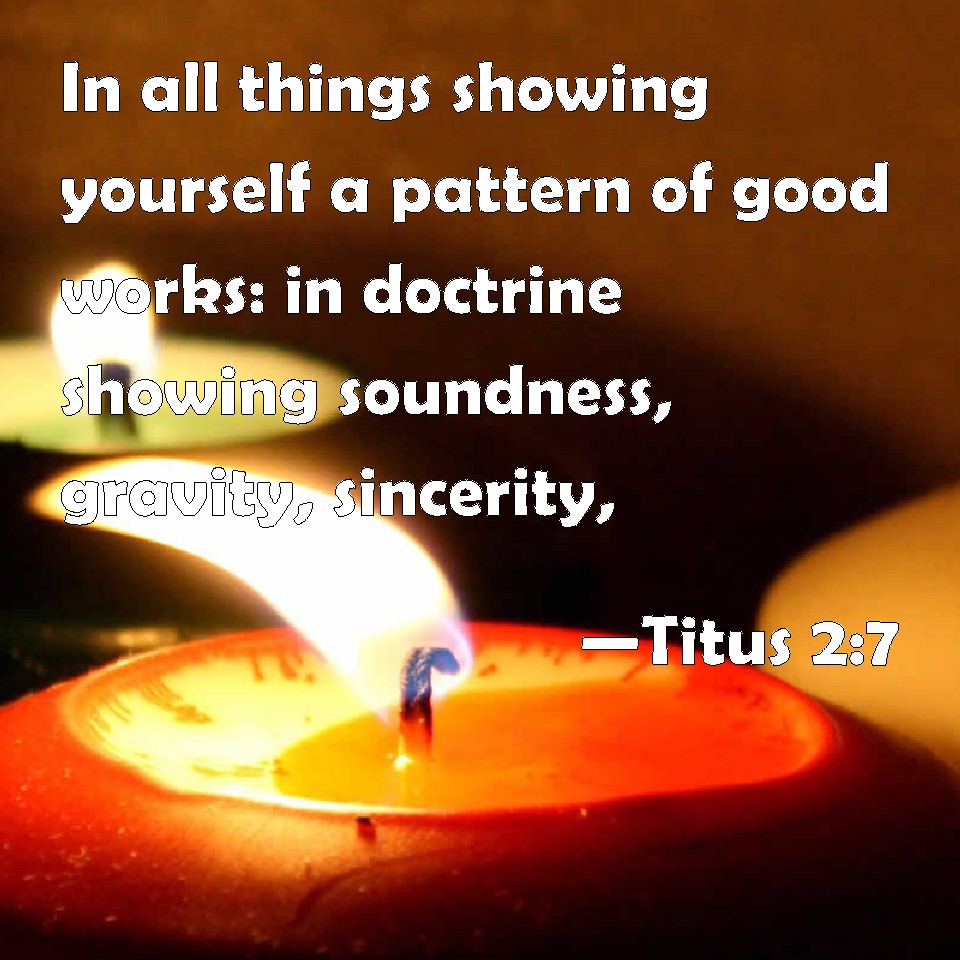 Choose a Background Titus 2:7 In all things showing yourself a pattern of good works: in doctrine showing soundness, gravity, sincerity, KJV: In all things shewing thyself a pattern of good works: in doctrine shewing uncorruptness, gravity, sincerity, DRB: In all things shew thyself an example of good works, in doctrine, in integrity, in gravity, DBT: in all things affording thyself as a pattern of good works; in teaching uncorruptedness, gravity, ERV: in all things shewing thyself an ensample of good works; in thy doctrine shewing uncorruptness, gravity, WBT: In all things showing thyself a pattern of good works: in doctrine showing incorruptness, gravity, sincerity, WEB: in all things showing yourself an example of good works; in your teaching showing integrity, seriousness, incorruptibility, YLT: concerning all things thyself showing a pattern of good works; in the teaching uncorruptedness, gravity, incorruptibility,Links Titus 2:7 NIV • Titus 2:7 NLT • Titus 2:7 ESV • Titus 2:7 NASB • Titus 2:7 KJV • Titus 2:7 Interlinear • Titus 2:7 Commentaries • Titus 2:7 Parallel Texts • Titus 2:7 Bible Apps • Titus 2:7 Parallel • Bible Hub |