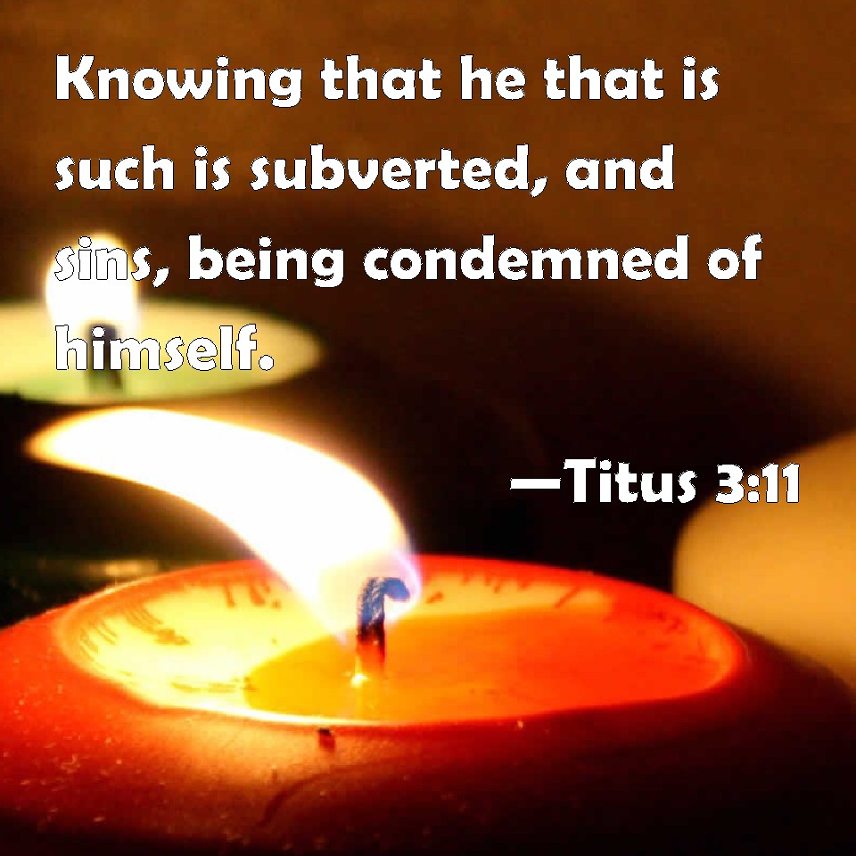 Choose a Background Titus 3:11 Knowing that he that is such is subverted, and sins, being condemned of himself. KJV: Knowing that he that is such is subverted, and sinneth, being condemned of himself. DRB: Knowing that he, that is such an one, is subverted, and sinneth, being condemned by his own judgment. DBT: knowing that such a one is perverted, and sins, being self-condemned. ERV: knowing that such a one is perverted, and sinneth, being self-condemned. WBT: Knowing that he who is such, is subverted, and sinneth, being condemned by himself. WEB: knowing that such a one is perverted, and sins, being self-condemned. YLT: having known that he hath been subverted who is such, and doth sin, being self-condemned.Links Titus 3:11 NIV • Titus 3:11 NLT • Titus 3:11 ESV • Titus 3:11 NASB • Titus 3:11 KJV • Titus 3:11 Interlinear • Titus 3:11 Commentaries • Titus 3:11 Parallel Texts • Titus 3:11 Bible Apps • Titus 3:11 Parallel • Bible Hub |