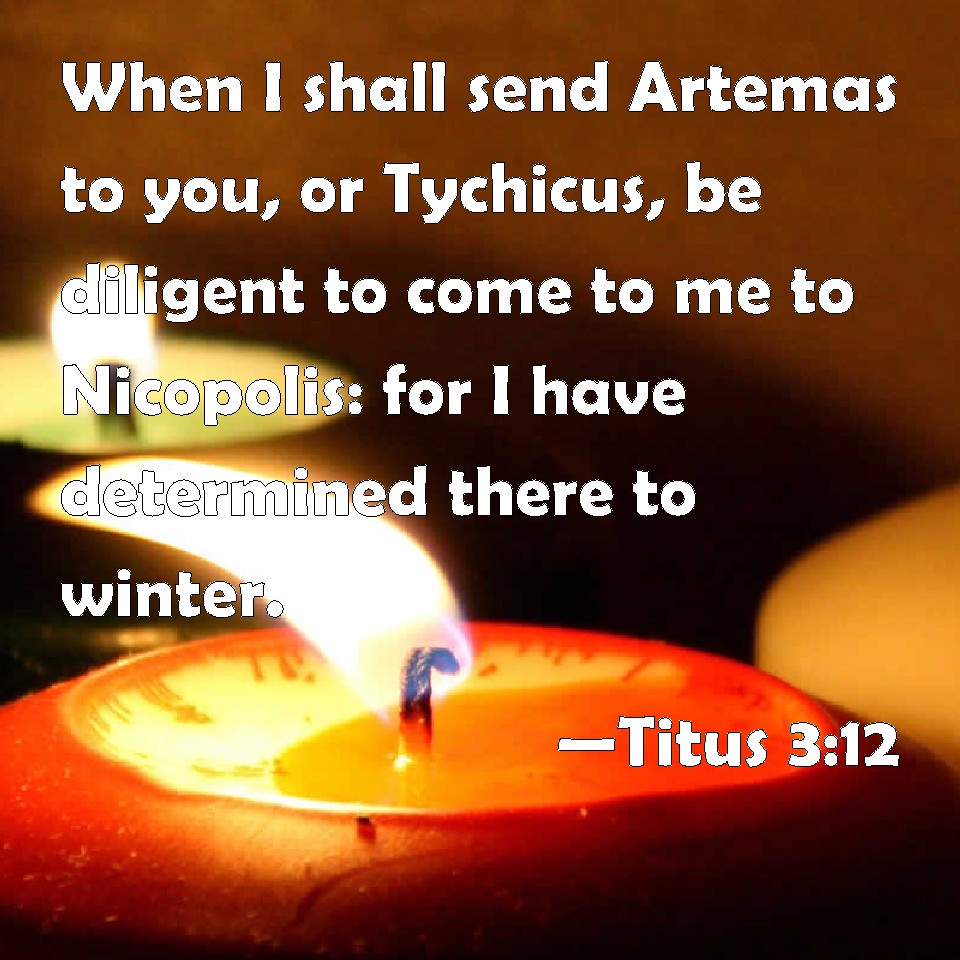 Choose a Background Titus 3:12 When I shall send Artemas to you, or Tychicus, be diligent to come to me to Nicopolis: for I have determined there to winter. KJV: When I shall send Artemas unto thee, or Tychicus, be diligent to come unto me to Nicopolis: for I have determined there to winter. DRB: When I shall send to thee Artemas or Tychicus, make haste to come unto me to Nicopolis. For there I have determined to winter. DBT: When I shall send Artemas to thee, or Tychicus, use diligence to come to me to Nicopolis; for I have decided to winter there. ERV: When I shall send Artemas unto thee, or Tychicus, give diligence to come unto me to Nicopolis: for there I have determined to winter. WBT: When I shall send Artemas to thee, or Tychicus, be diligent to come to me to Nicopolis: for I have determined there to winter. WEB: When I send Artemas to you, or Tychicus, be diligent to come to me to Nicopolis, for I have determined to winter there. YLT: When I shall send Artemas unto thee, or Tychicus, be diligent to come unto me to Nicopolis, for there to winter I have determined.Links Titus 3:12 NIV • Titus 3:12 NLT • Titus 3:12 ESV • Titus 3:12 NASB • Titus 3:12 KJV • Titus 3:12 Interlinear • Titus 3:12 Commentaries • Titus 3:12 Parallel Texts • Titus 3:12 Bible Apps • Titus 3:12 Parallel • Bible Hub |