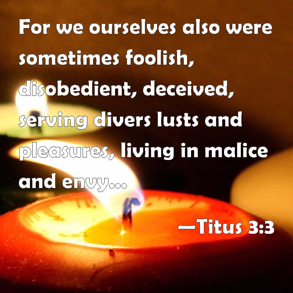 Choose a Background Titus 3:3 For we ourselves also were sometimes foolish, disobedient, deceived, serving divers lusts and pleasures, living in malice and envy, hateful, and hating one another. KJV: For we ourselves also were sometimes foolish, disobedient, deceived, serving divers lusts and pleasures, living in malice and envy, hateful, and hating one another. DRB: For we ourselves also were some time unwise, incredulous, erring, slaves to divers desires and pleasures, living in malice and envy, hateful, and hating one another. DBT: For we were once ourselves also without intelligence, disobedient, wandering in error, serving various lusts and pleasures, living in malice and envy, hateful, and hating one another. ERV: For we also were aforetime foolish, disobedient, deceived, serving divers lusts and pleasures, living in malice and envy, hateful, hating one another. WBT: For we ourselves also were sometimes foolish, disobedient, deceived, serving divers lusts and pleasures, living in malice and envy, hateful, and hating one another. WEB: For we were also once foolish, disobedient, deceived, serving various lusts and pleasures, living in malice and envy, hateful, and hating one another. YLT: for we were once — also we — thoughtless, disobedient, led astray, serving desires and pleasures manifold, in malice and envy living, odious — hating one another;Links Titus 3:3 NIV • Titus 3:3 NLT • Titus 3:3 ESV • Titus 3:3 NASB • Titus 3:3 KJV • Titus 3:3 Interlinear • Titus 3:3 Commentaries • Titus 3:3 Parallel Texts • Titus 3:3 Bible Apps • Titus 3:3 Parallel • Bible Hub |
