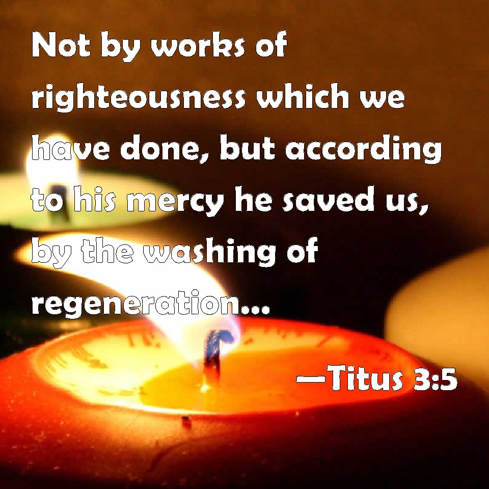 Choose a Background Titus 3:5 Not by works of righteousness which we have done, but according to his mercy he saved us, by the washing of regeneration, and renewing of the Holy Ghost; KJV: Not by works of righteousness which we have done, but according to his mercy he saved us, by the washing of regeneration, and renewing of the Holy Ghost; DRB: Not by the works of justice, which we have done, but according to his mercy, he saved us, by the laver of regeneration, and renovation of the Holy Ghost; DBT: not on the principle of works which have been done in righteousness which we had done, but according to his own mercy he saved us through the washing of regeneration and renewal of the Holy Spirit, ERV: not by works done in righteousness, which we did ourselves, but according to his mercy he saved us, through the washing of regeneration and renewing of the Holy Ghost, WBT: Not by works of righteousness which we have done, but according to his mercy he saved us, by the washing of regeneration, and renewing of the Holy Spirit; WEB: not by works of righteousness, which we did ourselves, but according to his mercy, he saved us, through the washing of regeneration and renewing by the Holy Spirit, YLT: (not by works that are in righteousness that we did but according to His kindness,) He did save us, through a bathing of regeneration, and a renewing of the Holy Spirit,Links Titus 3:5 NIV • Titus 3:5 NLT • Titus 3:5 ESV • Titus 3:5 NASB • Titus 3:5 KJV • Titus 3:5 Interlinear • Titus 3:5 Commentaries • Titus 3:5 Parallel Texts • Titus 3:5 Bible Apps • Titus 3:5 Parallel • Bible Hub |