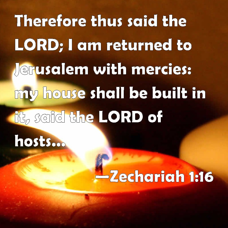 Choose a Background Zechariah 1:16 Therefore thus said the LORD; I am returned to Jerusalem with mercies: my house shall be built in it, said the LORD of hosts, and a line shall be stretched forth on Jerusalem. KJV: Therefore thus saith the LORD; I am returned to Jerusalem with mercies: my house shall be built in it, saith the LORD of hosts, and a line shall be stretched forth upon Jerusalem. DRB: Therefore thus saith the Lord: I will return to Jerusalem in mercies: my house shall be built in it, saith the Lord of hosts: and the building line shall be stretched forth upon Jerusalem. DBT: Therefore thus saith Jehovah: I am returned to Jerusalem with mercies: my house shall be built in it, saith Jehovah of hosts, and the line shall be stretched forth upon Jerusalem. ERV: Therefore thus saith the LORD: I am returned to Jerusalem with mercies; my house shall be built in it, saith the LORD of hosts, and a line shall be stretched forth over Jerusalem. WBT: Therefore thus saith the LORD; I have returned to Jerusalem with mercies: my house shall be built in it, saith the LORD of hosts, and a line shall be stretched forth upon Jerusalem. WEB: Therefore thus says Yahweh: "I have returned to Jerusalem with mercy. My house shall be built in it," says Yahweh of Armies, "and a line shall be stretched forth over Jerusalem."' YLT: Therefore, thus said Jehovah: I have turned to Jerusalem with mercies, My house is built in it, An affirmation of Jehovah of Hosts, And a line is stretched over Jerusalem.Links Zechariah 1:16 NIV • Zechariah 1:16 NLT • Zechariah 1:16 ESV • Zechariah 1:16 NASB • Zechariah 1:16 KJV • Zechariah 1:16 Interlinear • Zechariah 1:16 Commentaries • Zechariah 1:16 Parallel Texts • Zechariah 1:16 Bible Apps • Zechariah 1:16 Parallel • Bible Hub |