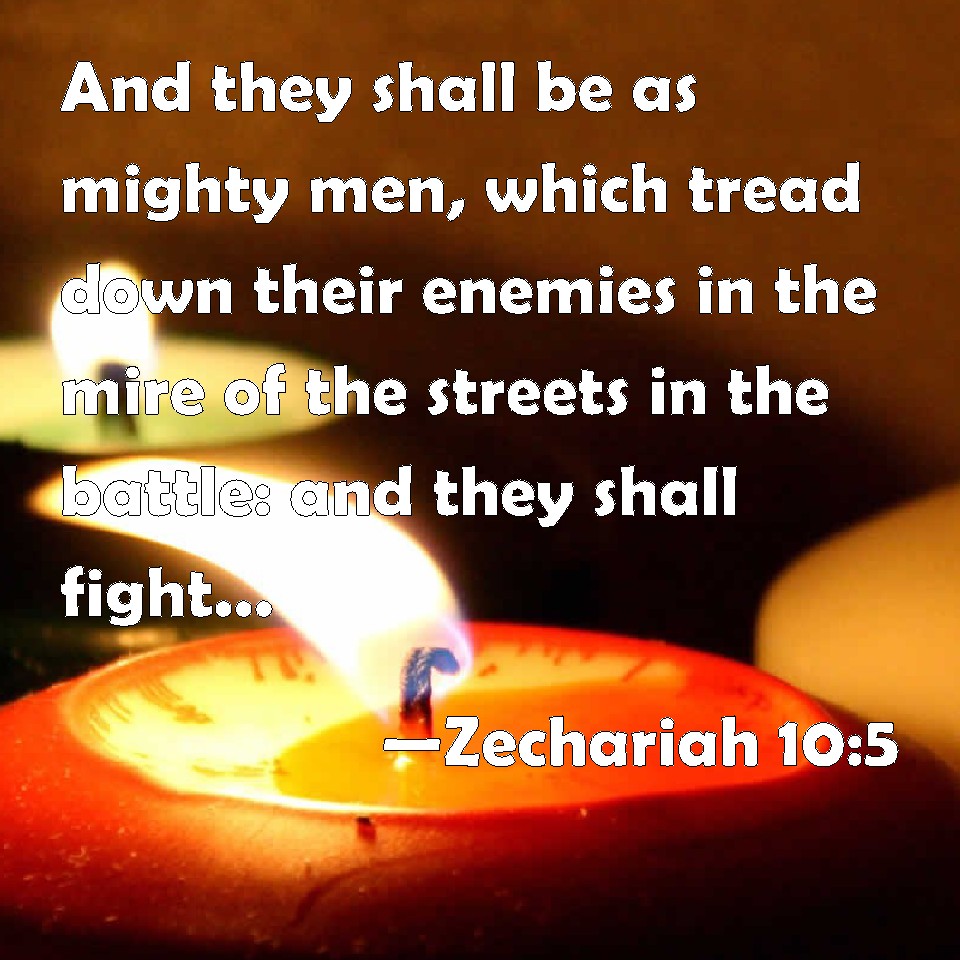 Choose a Background Zechariah 10:5 And they shall be as mighty men, which tread down their enemies in the mire of the streets in the battle: and they shall fight, because the LORD is with them, and the riders on horses shall be confounded. KJV: And they shall be as mighty men, which tread down their enemies in the mire of the streets in the battle: and they shall fight, because the LORD is with them, and the riders on horses shall be confounded. DRB: And they shall be as mighty men, treading under foot the mire of the ways in battle: and they shall fight, because the Lord is with them, and the riders of horses shall be confounded. DBT: And they shall be as mighty men, treading down the mire of the streets in the battle; and they shall fight, for Jehovah is with them, and the riders on horses shall be put to shame. ERV: And they shall be as mighty men, treading down their enemies in the mire of the streets in the battle; and they shall fight, because the LORD is with them: and the riders on horses shall be confounded. WBT: And they shall be as mighty men, who tread down their enemies in the mire of the streets in the battle: and they shall fight, because the LORD is with them, and the riders on horses shall be confounded. WEB: They shall be as mighty men, treading down muddy streets in the battle; and they shall fight, because Yahweh is with them; and the riders on horses will be confounded. YLT: And they have been as heroes, Treading in mire of out-places in battle, And they have fought, for Jehovah is with them, And have put to shame riders of horses.Links Zechariah 10:5 NIV • Zechariah 10:5 NLT • Zechariah 10:5 ESV • Zechariah 10:5 NASB • Zechariah 10:5 KJV • Zechariah 10:5 Interlinear • Zechariah 10:5 Commentaries • Zechariah 10:5 Parallel Texts • Zechariah 10:5 Bible Apps • Zechariah 10:5 Parallel • Bible Hub |