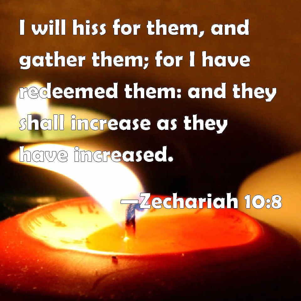 Choose a Background Zechariah 10:8 I will hiss for them, and gather them; for I have redeemed them: and they shall increase as they have increased. KJV: I will hiss for them, and gather them; for I have redeemed them: and they shall increase as they have increased. DRB: I will whistle for them, and I will gather them together, because I have redeemed them: and I will multiply them as they were multiplied before. DBT: I will hiss for them, and gather them; for I have redeemed them: and they shall multiply as they used to multiply. ERV: I will hiss for them, and gather them; for I have redeemed them: and they shall increase as they have increased. WBT: I will hiss for them, and gather them: for I have redeemed them: and they shall increase as they have increased. WEB: I will signal for them, and gather them; for I have redeemed them; and they will increase as they have increased. YLT: I hist for them, and I gather them, For I have redeemed them, And they have multiplied as they did multiply.Links Zechariah 10:8 NIV • Zechariah 10:8 NLT • Zechariah 10:8 ESV • Zechariah 10:8 NASB • Zechariah 10:8 KJV • Zechariah 10:8 Interlinear • Zechariah 10:8 Commentaries • Zechariah 10:8 Parallel Texts • Zechariah 10:8 Bible Apps • Zechariah 10:8 Parallel • Bible Hub |