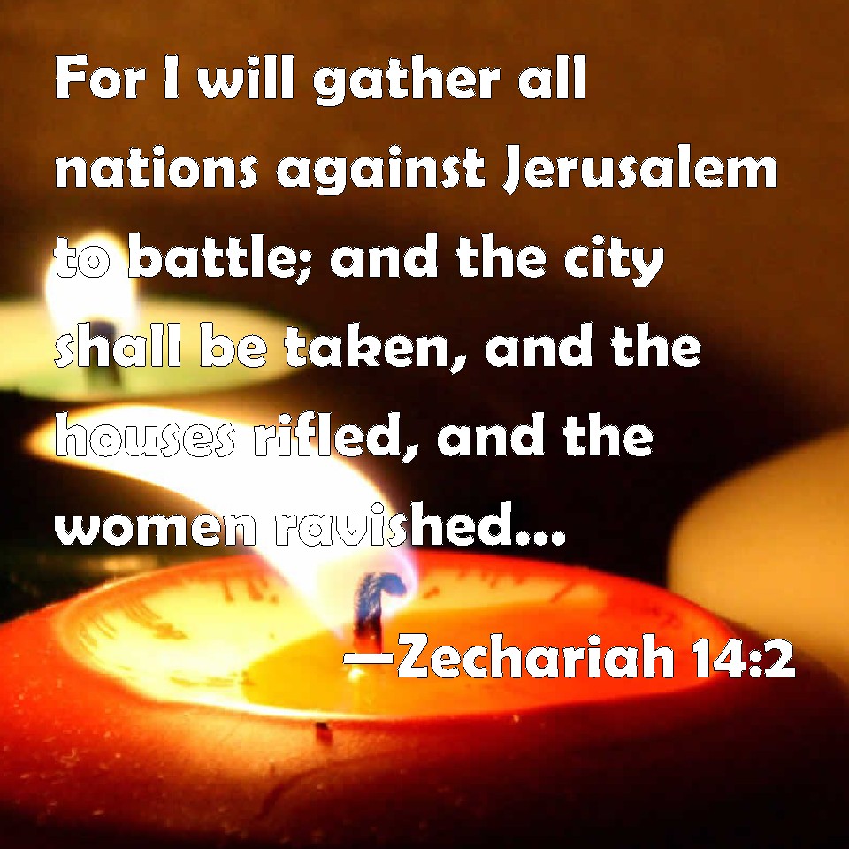Choose a Background Zechariah 14:2 For I will gather all nations against Jerusalem to battle; and the city shall be taken, and the houses rifled, and the women ravished; and half of the city shall go forth into captivity, and the residue of the people shall not be cut off from the city. KJV: For I will gather all nations against Jerusalem to battle; and the city shall be taken, and the houses rifled, and the women ravished; and half of the city shall go forth into captivity, and the residue of the people shall not be cut off from the city. DRB: And I will gather all nations to Jerusalem to battle, and the city shall be taken, and the houses shall be rifled, and the women shall be defiled: and half of the city shall go forth into captivity, and the rest of the people shall not be taken away out of the city. DBT: And I will assemble all the nations against Jerusalem to battle; and the city shall be taken, and the houses rifled, and the women ravished; and half of the city shall go forth into captivity; and the rest of the people shall not be cut off from the city. ERV: For I will gather all nations against Jerusalem to battle; and the city shall be taken, and the houses rifled, and the women ravished: and half of the city shall go forth into captivity, and the residue of the people shall not be cut off from the city. WBT: For I will gather all nations against Jerusalem to battle; and the city shall be taken, and the houses rifled, and the women ravished; and half of the city shall go forth into captivity, and the residue of the people shall not be cut off from the city. WEB: For I will gather all nations against Jerusalem to battle; and the city will be taken, the houses rifled, and the women ravished. Half of the city will go out into captivity, and the rest of the people will not be cut off from the city. YLT: And I have gathered all the nations unto Jerusalem to battle, And captured hath been the city, And spoiled have been the houses, And the women are lain with, Gone forth hath half the city in a removal, And the remnant of the people are not cut off from the city.Links Zechariah 14:2 NIV • Zechariah 14:2 NLT • Zechariah 14:2 ESV • Zechariah 14:2 NASB • Zechariah 14:2 KJV • Zechariah 14:2 Interlinear • Zechariah 14:2 Commentaries • Zechariah 14:2 Parallel Texts • Zechariah 14:2 Bible Apps • Zechariah 14:2 Parallel • Bible Hub |