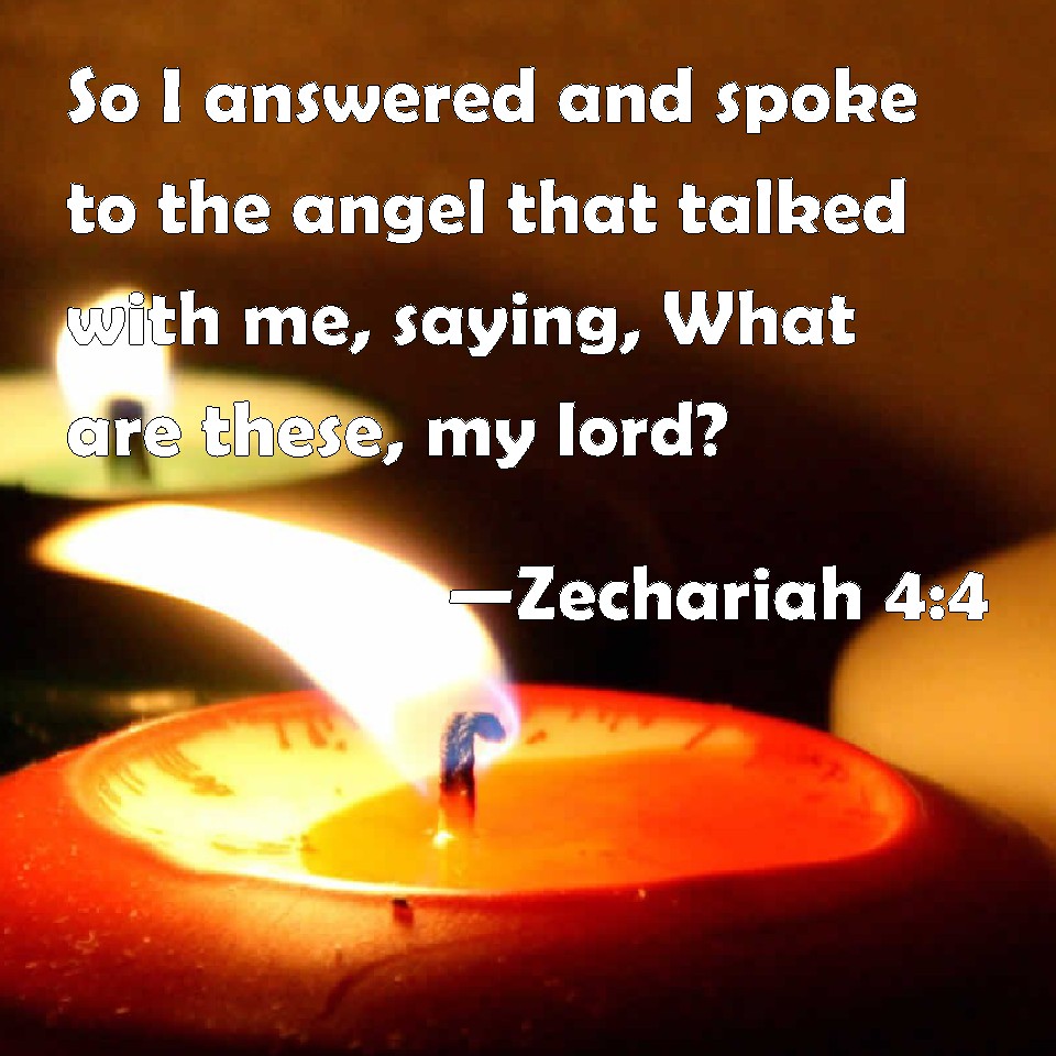 Choose a Background Zechariah 4:4 So I answered and spoke to the angel that talked with me, saying, What are these, my lord? KJV: So I answered and spake to the angel that talked with me, saying, What are these, my lord? DRB: And I answered, and said to the angel that spoke in me, saying: What are these things, my lord? DBT: And I answered and spoke to the angel that talked with me, saying, What are these, my lord? ERV: And I answered and spake to the angel that talked with me, saying, What are these, my lord? WBT: So I answered and spoke to the angel that talked with me, saying, What are these, my lord? WEB: I answered and spoke to the angel who talked with me, saying, "What are these, my lord?" YLT: And I answer and speak unto the messenger who is speaking with me, saying, 'What are these, my lord?'Links Zechariah 4:4 NIV • Zechariah 4:4 NLT • Zechariah 4:4 ESV • Zechariah 4:4 NASB • Zechariah 4:4 KJV • Zechariah 4:4 Interlinear • Zechariah 4:4 Commentaries • Zechariah 4:4 Parallel Texts • Zechariah 4:4 Bible Apps • Zechariah 4:4 Parallel • Bible Hub |