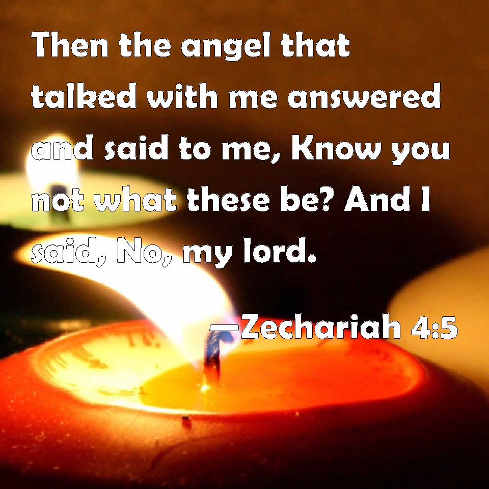 Choose a Background Zechariah 4:5 Then the angel that talked with me answered and said to me, Know you not what these be? And I said, No, my lord. KJV: Then the angel that talked with me answered and said unto me, Knowest thou not what these be? And I said, No, my lord. DRB: And the angel that spoke in me answered, and said to me: Knowest thou not what these things are? And I said: No, my lord. DBT: And the angel that talked with me answered and said unto me, Knowest thou not what these are? And I said, No, my lord. ERV: Then the angel that talked with me answered and said unto me, Knowest thou not what these be? And I said, No, my lord. WBT: Then the angel that talked with me answered and said to me, Knowest thou not what these are? and I said, No, my lord. WEB: Then the angel who talked with me answered me, "Don't you know what these are?" I said, "No, my lord." YLT: And the messenger who is speaking with me answereth and saith unto me, 'Hast thou not known what these are?' And I say, 'No, my lord.'Links Zechariah 4:5 NIV • Zechariah 4:5 NLT • Zechariah 4:5 ESV • Zechariah 4:5 NASB • Zechariah 4:5 KJV • Zechariah 4:5 Interlinear • Zechariah 4:5 Commentaries • Zechariah 4:5 Parallel Texts • Zechariah 4:5 Bible Apps • Zechariah 4:5 Parallel • Bible Hub |
