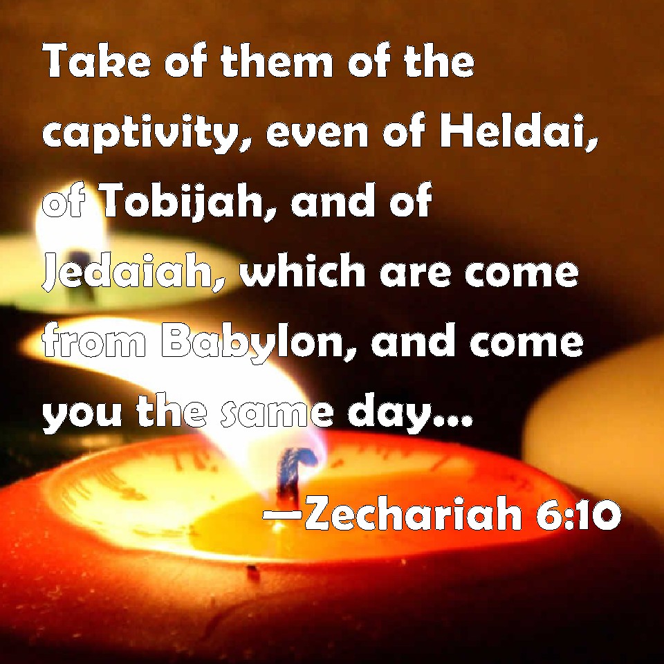 Choose a Background Zechariah 6:10 Take of them of the captivity, even of Heldai, of Tobijah, and of Jedaiah, which are come from Babylon, and come you the same day, and go into the house of Josiah the son of Zephaniah; KJV: Take of them of the captivity, even of Heldai, of Tobijah, and of Jedaiah, which are come from Babylon, and come thou the same day, and go into the house of Josiah the son of Zephaniah; DRB: Take of them of the captivity, of Holdai, and of Tobias, and of Idaias; thou shalt come in that day, and shalt go into the house of Josias, the son of Sophonias, who came out of Babylon. DBT: Take gifts of them of the captivity, of Heldai, of Tobijah, and of Jedaiah, and come thou the same day, and enter into the house of Josiah the son of Zephaniah, whither they are come from Babylon; ERV: Take of them of the captivity, even of Heldai, of Tobijah, and of Jedaiah; and come thou the same day, and go into the house of Josiah the son of Zephaniah, whither they are come from Babylon; WBT: Take of them of the captivity, even of Heldai, of Tobijah, and of Jedaiah, who are come from Babylon, and come thou the same day, and go into the house of Josiah the son of Zephaniah; WEB: "Take of them of the captivity, even of Heldai, of Tobijah, and of Jedaiah; and come the same day, and go into the house of Josiah the son of Zephaniah, where they have come from Babylon. YLT: to take of the captivity (who came from Babylon) from Heldai, from Tobijah, and from Jedaiah, 'and thou hast come in — thou, in that day, yea, thou hast come into the house of Josiah son of Zephaniah,Links Zechariah 6:10 NIV • Zechariah 6:10 NLT • Zechariah 6:10 ESV • Zechariah 6:10 NASB • Zechariah 6:10 KJV • Zechariah 6:10 Interlinear • Zechariah 6:10 Commentaries • Zechariah 6:10 Parallel Texts • Zechariah 6:10 Bible Apps • Zechariah 6:10 Parallel • Bible Hub |