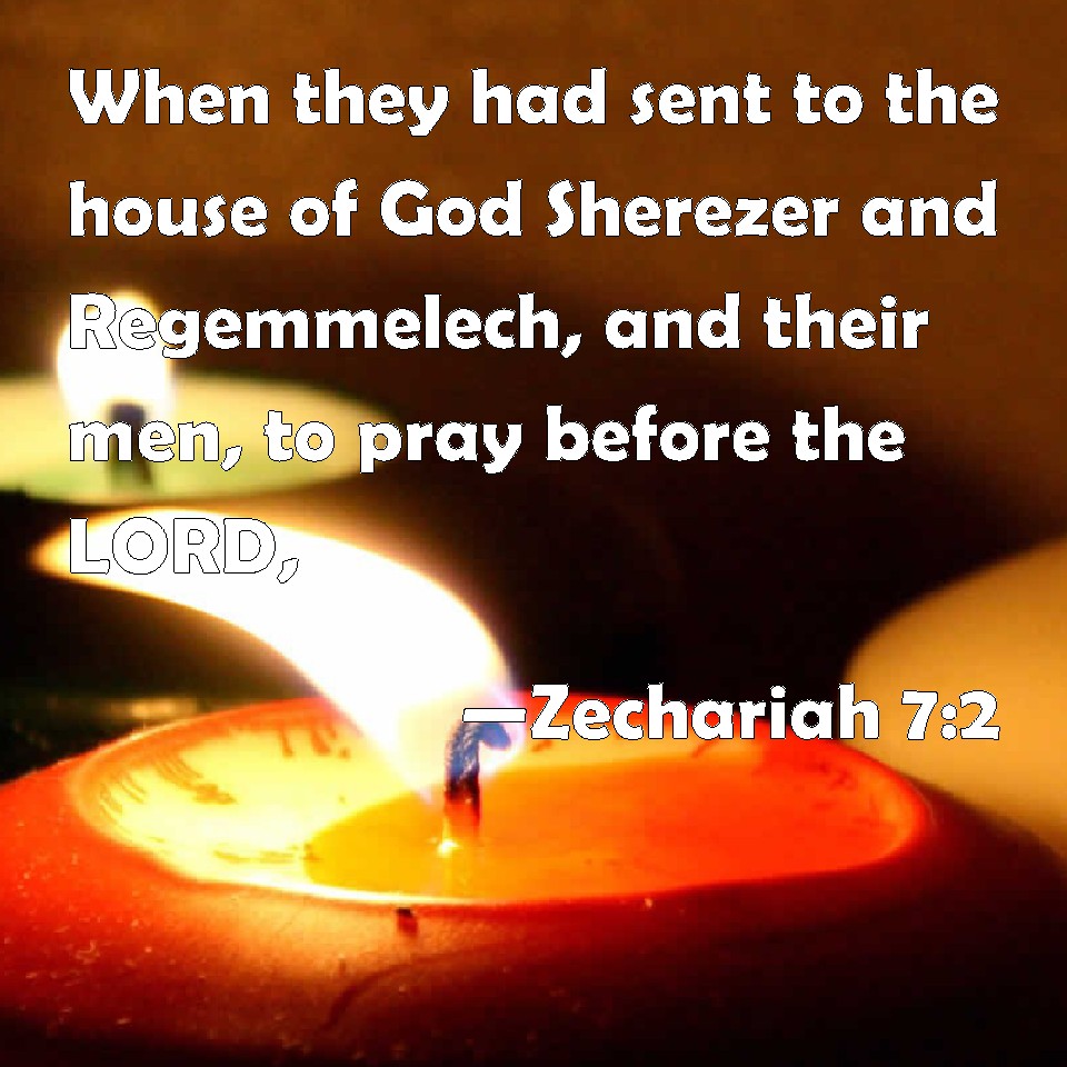Choose a Background Zechariah 7:2 When they had sent to the house of God Sherezer and Regemmelech, and their men, to pray before the LORD, KJV: When they had sent unto the house of God Sherezer and Regemmelech, and their men, to pray before the LORD, DRB: When Sarasar, and Rogommelech, and the men that were with him, sent to the house of God, to entreat the face of the Lord: DBT: when Bethel had sent Sherezer and Regem-melech, and his men, to supplicate Jehovah, ERV: Now they of Beth-el had sent Sharezer and Regem-melech, and their men, to entreat the favour of the LORD, WBT: When they had sent to the house of God Sherezer and Regem-melech, and their men, to pray before the LORD, WEB: The people of Bethel sent Sharezer and Regem Melech, and their men, to entreat Yahweh's favor, YLT: And Beth-El sendeth Sherezer and Regem-Melech, and its men, to appease the face of Jehovah,Links Zechariah 7:2 NIV • Zechariah 7:2 NLT • Zechariah 7:2 ESV • Zechariah 7:2 NASB • Zechariah 7:2 KJV • Zechariah 7:2 Interlinear • Zechariah 7:2 Commentaries • Zechariah 7:2 Parallel Texts • Zechariah 7:2 Bible Apps • Zechariah 7:2 Parallel • Bible Hub |