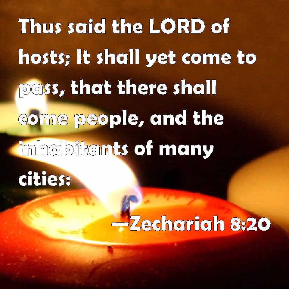 Choose a Background Zechariah 8:20 Thus said the LORD of hosts; It shall yet come to pass, that there shall come people, and the inhabitants of many cities: KJV: Thus saith the LORD of hosts; It shall yet come to pass, that there shall come people, and the inhabitants of many cities: DRB: Thus saith the Lord of hosts, until people come, and dwell in many cities, DBT: Thus saith Jehovah of hosts: Yet again shall there come peoples, and the inhabitants of many cities; ERV: Thus saith the LORD of hosts: It shall yet come to pass, that there shall come peoples, and the inhabitants of many cities: WBT: Thus saith the LORD of hosts: It shall yet come to pass, that there shall come people, and the inhabitants of many cities: WEB: Thus says Yahweh of Armies: "Many peoples, and the inhabitants of many cities will yet come; YLT: Thus said Jehovah of Hosts: Yet come do peoples, and inhabitants of many cities,Links Zechariah 8:20 NIV • Zechariah 8:20 NLT • Zechariah 8:20 ESV • Zechariah 8:20 NASB • Zechariah 8:20 KJV • Zechariah 8:20 Interlinear • Zechariah 8:20 Commentaries • Zechariah 8:20 Parallel Texts • Zechariah 8:20 Bible Apps • Zechariah 8:20 Parallel • Bible Hub |