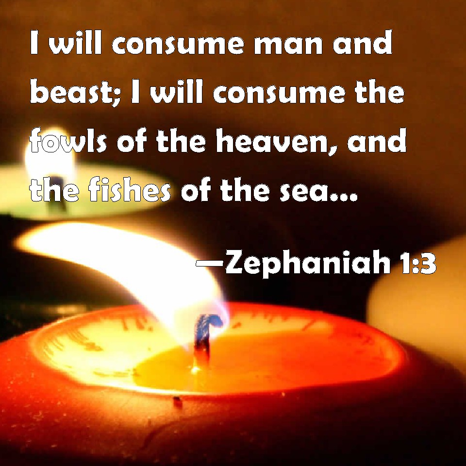 Choose a Background Zephaniah 1:3 I will consume man and beast; I will consume the fowls of the heaven, and the fishes of the sea, and the stumbling blocks with the wicked: and I will cut off man from off the land, said the LORD. KJV: I will consume man and beast; I will consume the fowls of the heaven, and the fishes of the sea, and the stumblingblocks with the wicked; and I will cut off man from off the land, saith the LORD. DRB: I will gather man, and beast, I will gather the birds of the air, and the fishes of the sea: and the ungodly shall meet with ruin: and I will destroy men from off the face of the land, saith the Lord. DBT: I will take away man and beast; I will take away the fowl of the heavens and the fishes of the sea, and the stumbling-blocks with the wicked, and I will cut off mankind from off the face of the ground, saith Jehovah. ERV: I will consume man and beast; I will consume the fowls of the heaven, and the fishes of the sea, and the stumblingblocks with the wicked; and I will cut off man from off the face of the ground, saith the LORD. WBT: I will consume man and beast; I will consume the fowls of the heaven, and the fishes of the sea, and the stumbling-blocks with the wicked; and I will cut off man from off the land, saith the LORD. WEB: I will sweep away man and animal. I will sweep away the birds of the sky, the fish of the sea, and the heaps of rubble with the wicked. I will cut off man from the surface of the earth, says Yahweh. YLT: I consume man and beast, I consume fowl of the heavens, and fishes of the sea, And the stumbling-blocks — the wicked, And I have cut off man from the face of the ground, An affirmation of Jehovah,Links Zephaniah 1:3 NIV • Zephaniah 1:3 NLT • Zephaniah 1:3 ESV • Zephaniah 1:3 NASB • Zephaniah 1:3 KJV • Zephaniah 1:3 Interlinear • Zephaniah 1:3 Commentaries • Zephaniah 1:3 Parallel Texts • Zephaniah 1:3 Bible Apps • Zephaniah 1:3 Parallel • Bible Hub |