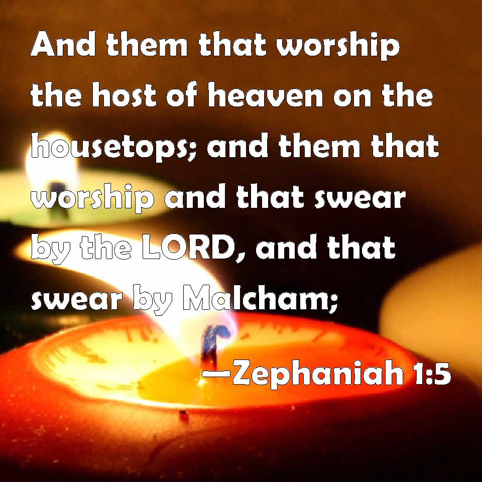 Choose a Background Zephaniah 1:5 And them that worship the host of heaven on the housetops; and them that worship and that swear by the LORD, and that swear by Malcham; KJV: And them that worship the host of heaven upon the housetops; and them that worship and that swear by the LORD, and that swear by Malcham; DRB: And them that worship the host of heaven upon the tops of houses, and them that adore, and swear by the Lord, and swear by Melchom. DBT: and them that bow down to the host of the heavens upon the housetops; and them that bow down to Jehovah, that swear by him, and swear by Malcham; ERV: and them that worship the host of heaven upon the housetops; and them that worship, which swear to the LORD and swear by Malcam; WBT: And them that worship the host of heaven upon the house-tops; and them that worship and that swear by the LORD, and that swear by Malcham; WEB: those who worship the army of the sky on the housetops, those who worship and swear by Yahweh and also swear by Malcam, YLT: And those bowing themselves On the roofs to the host of the heavens, And those bowing themselves, Swearing to Jehovah, and swearing by Malcham,Links Zephaniah 1:5 NIV • Zephaniah 1:5 NLT • Zephaniah 1:5 ESV • Zephaniah 1:5 NASB • Zephaniah 1:5 KJV • Zephaniah 1:5 Interlinear • Zephaniah 1:5 Commentaries • Zephaniah 1:5 Parallel Texts • Zephaniah 1:5 Bible Apps • Zephaniah 1:5 Parallel • Bible Hub |