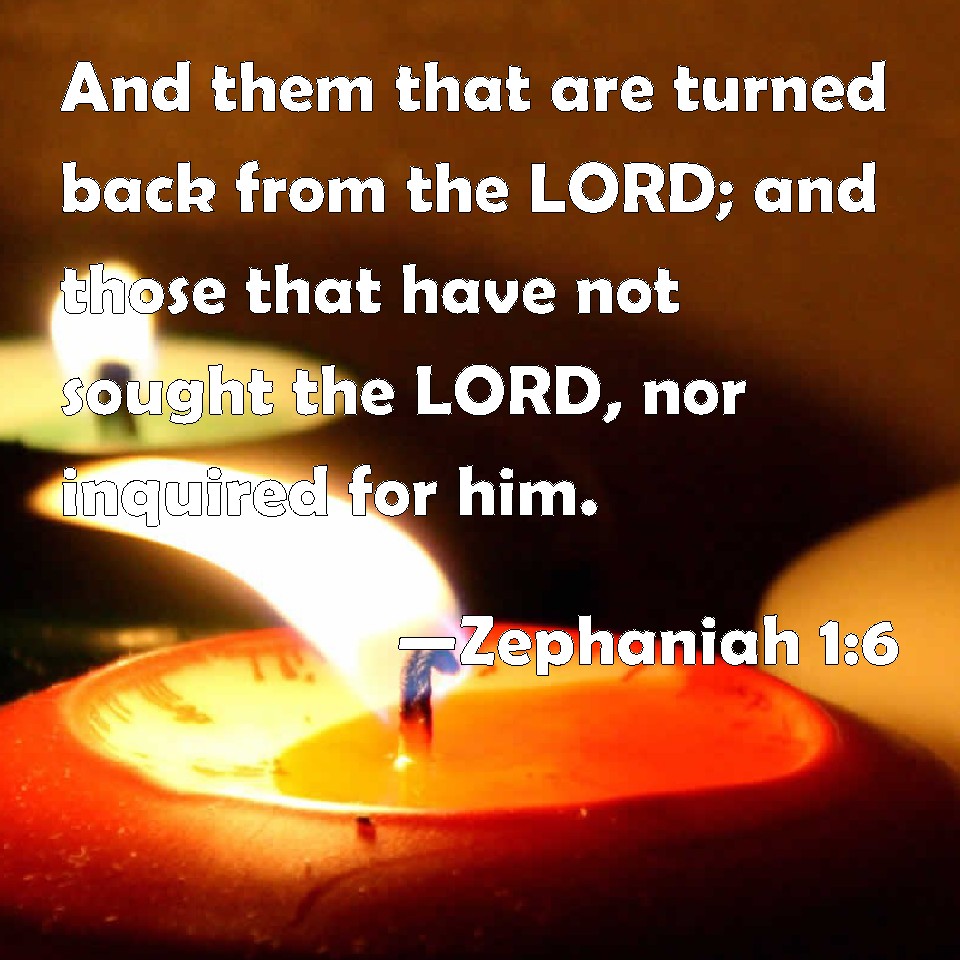 Choose a Background Zephaniah 1:6 And them that are turned back from the LORD; and those that have not sought the LORD, nor inquired for him. KJV: And them that are turned back from the LORD; and those that have not sought the LORD, nor inquired for him. DRB: And them that turn away from following after the Lord, and that have not sought the Lord, nor searched after him. DBT: and them that turn back from after Jehovah, and that do not seek Jehovah, nor inquire for him. ERV: and them that are turned back from following the LORD; and those that have not sought the LORD, nor inquired after him. WBT: And them that have turned back from the LORD; and those that have not sought the LORD, nor inquired for him. WEB: those who have turned back from following Yahweh, and those who haven't sought Yahweh nor inquired after him. YLT: And those removing from after Jehovah, And who have not sought Jehovah, nor besought Him.Links Zephaniah 1:6 NIV • Zephaniah 1:6 NLT • Zephaniah 1:6 ESV • Zephaniah 1:6 NASB • Zephaniah 1:6 KJV • Zephaniah 1:6 Interlinear • Zephaniah 1:6 Commentaries • Zephaniah 1:6 Parallel Texts • Zephaniah 1:6 Bible Apps • Zephaniah 1:6 Parallel • Bible Hub |