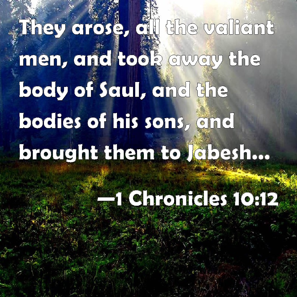Choose a Background 1 Chronicles 10:12 They arose, all the valiant men, and took away the body of Saul, and the bodies of his sons, and brought them to Jabesh, and buried their bones under the oak in Jabesh, and fasted seven days. KJV: They arose, all the valiant men, and took away the body of Saul, and the bodies of his sons, and brought them to Jabesh, and buried their bones under the oak in Jabesh, and fasted seven days. DRB: All the valiant men of them arose, and took the bodies of Saul and of his sons, and brought them to Jabes, and buried their bones under the oak that was in Jabes, and they fasted seven days. DBT: all the valiant men arose, and took up the body of Saul and the bodies of his sons, and brought them to Jabesh, and buried their bones under the terebinth of Jabesh, and fasted seven days. ERV: all the valiant men arose, and took away the body of Saul, and the bodies of his sons, and brought them to Jabesh, and buried their bones under the oak in Jabesh, and fasted seven days. WBT: They arose, all the valiant men, and took away the body of Saul, and the bodies of his sons, and brought them to Jabesh, and buried their bones under the oak in Jabesh, and fasted seven days. WEB: all the valiant men arose, and took away the body of Saul, and the bodies of his sons, and brought them to Jabesh, and buried their bones under the oak in Jabesh, and fasted seven days. YLT: and all the men of valour rise and bear away the body of Saul, and the bodies of his sons, and bring them in to Jabesh, and bury their bones under the oak in Jabesh, and fast seven days.Links 1 Chronicles 10:12 NIV • 1 Chronicles 10:12 NLT • 1 Chronicles 10:12 ESV • 1 Chronicles 10:12 NASB • 1 Chronicles 10:12 KJV • 1 Chronicles 10:12 Interlinear • 1 Chronicles 10:12 Commentaries • 1 Chronicles 10:12 Parallel Texts • 1 Chronicles 10:12 Bible Apps • 1 Chronicles 10:12 Parallel • Bible Hub |